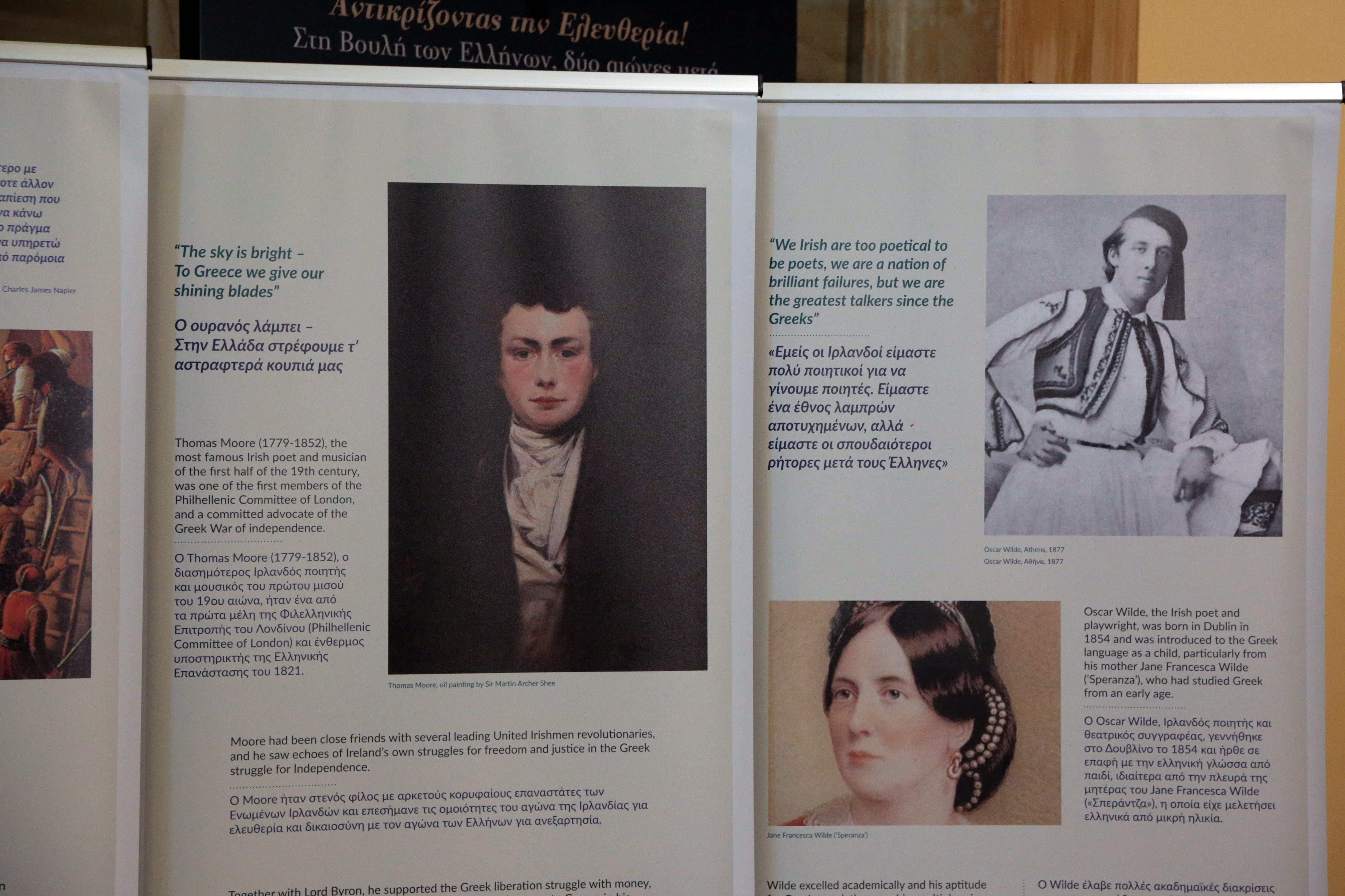 Η πρέσβης της Δημοκρατίας της Ιρλανδίας κυρία Ciara O’ Floinn, στο χαιρετισμό της ευχαρίστησε για την υποστήριξη τη Βουλή των Ελλήνων, όπως και το Υπουργείο Εξωτερικών που συνέβαλαν στην ανάδειξη αυτής της Έκθεσης, η οποία περιόδευσε ανά την Ελλάδα και τόνισε πως «με αυτήν κάνουμε αποτίμηση των 50 χρόνων διπλωματικών σχέσεων των δύο κρατών και προσβλέπουμε στα επόμενα 50 χρόνια». Επισημαίνοντας τις σχέσεις φιλίας και συνεργασίας, τους ισχυρούς δεσμούς και κοινές αρχές και αξίες, υπογράμμισε ότι με την ανάληψη της Προεδρίας της Ε.Ε. από την Ιρλανδία την 1η Ιουλίου 2026, θα ενισχυθεί η συνεργασία για τις βασικές προκλήσεις της εποχής, όπως η ασφάλεια, η άμυνα, η θαλάσσια ασφάλεια, η ανταγωνιστικότητα και η διεύρυνση της Ε.Ε..