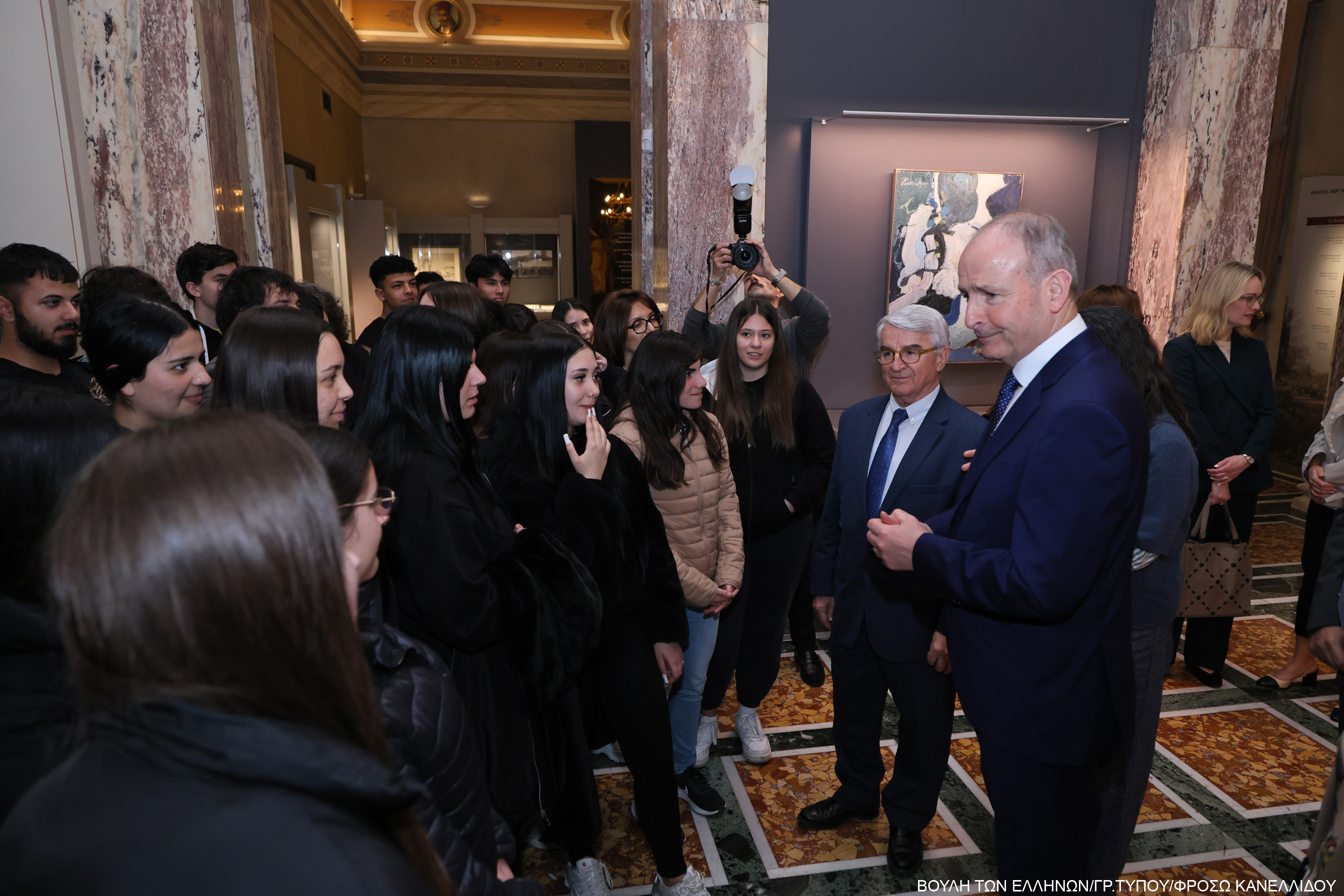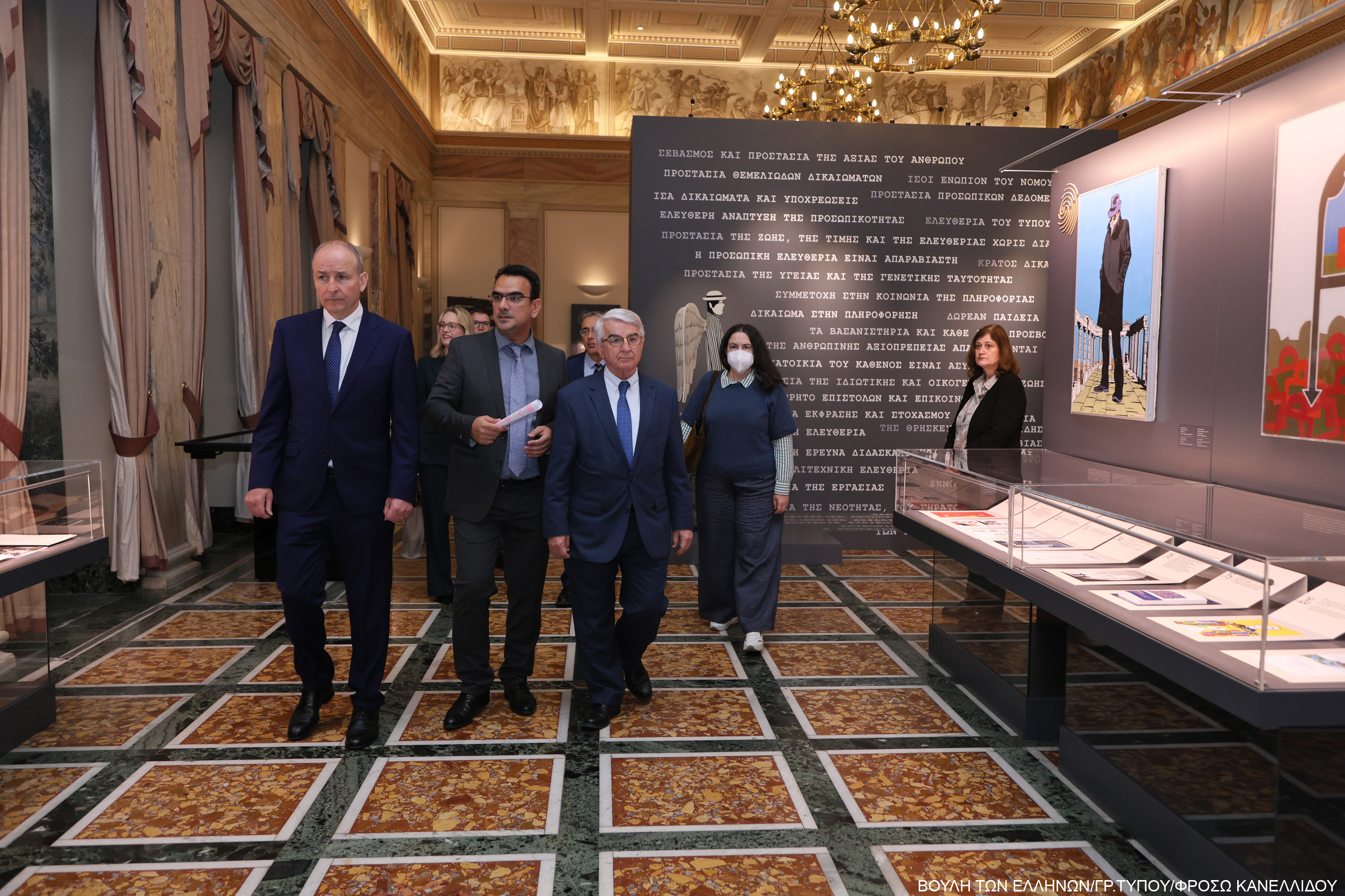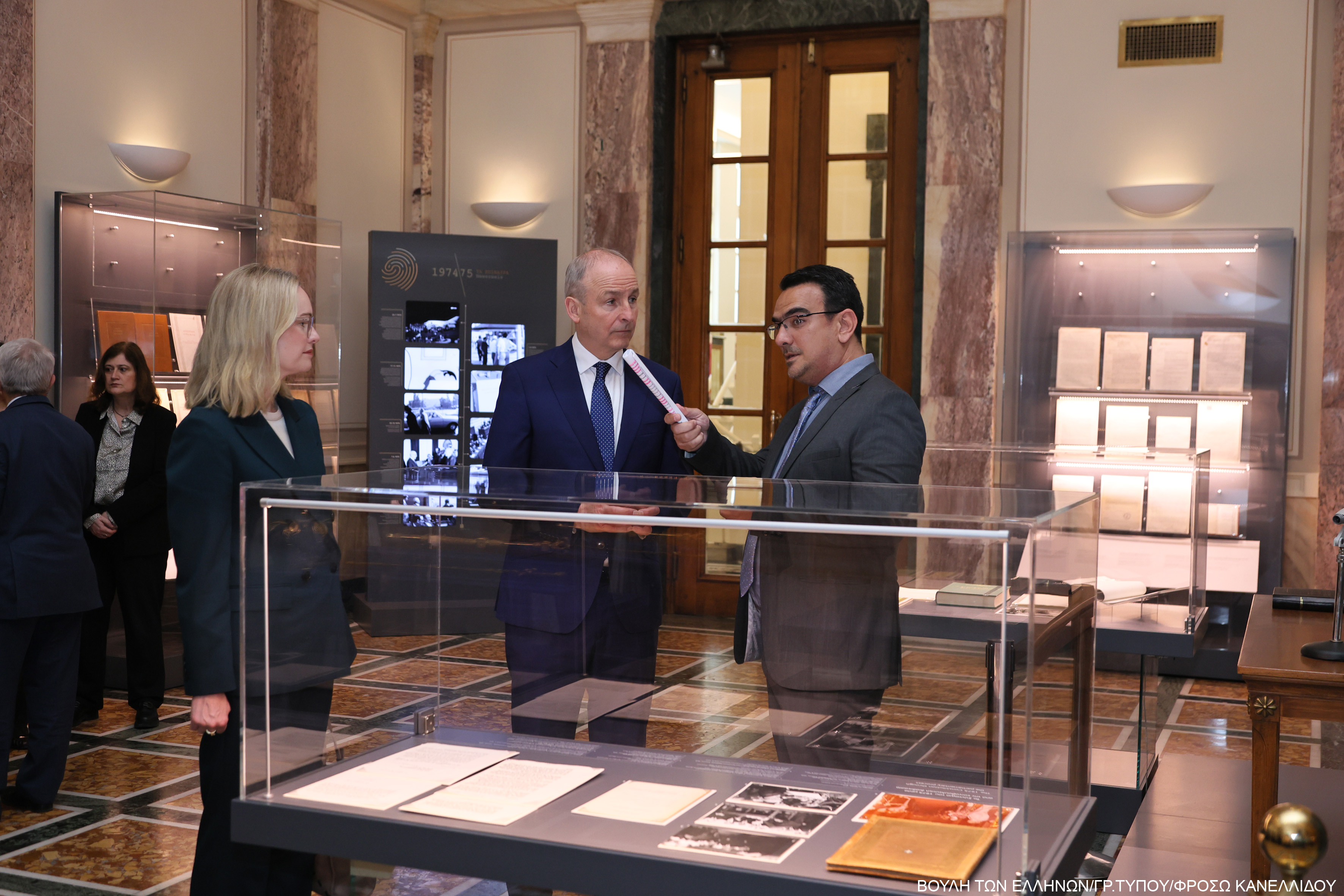 Ακολούθως ο Πρωθυπουργός της Ιρλανδίας ξεναγήθηκε στην έκθεση της Βουλής «Το δικό μας Σύνταγμα 1975-2025».