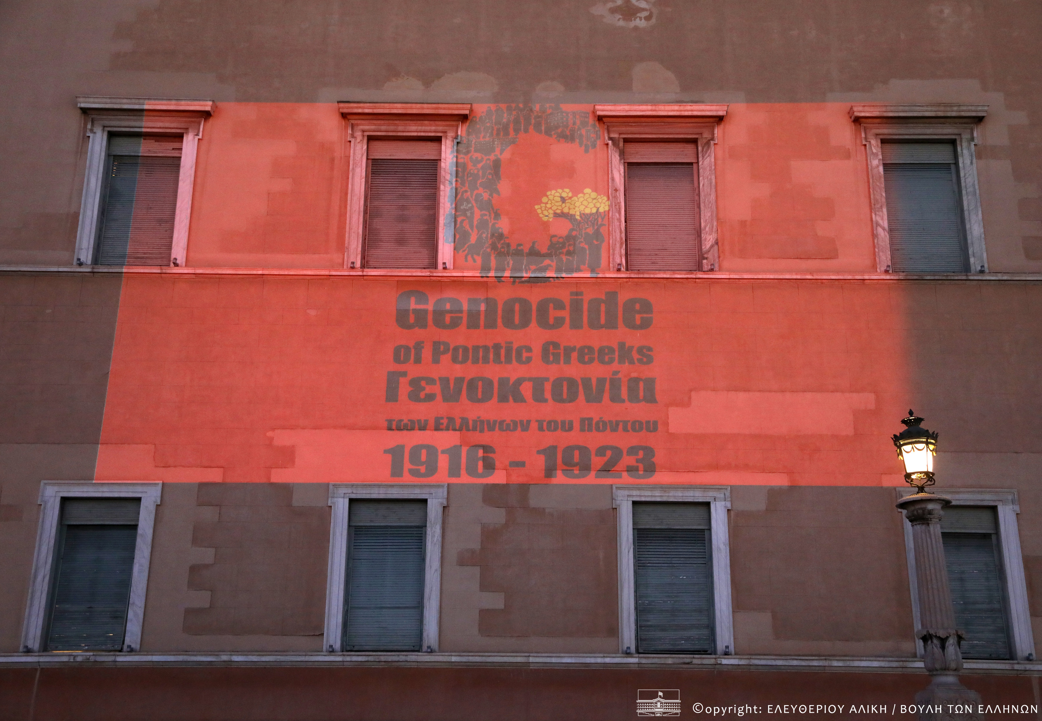 Η Βουλή των Ελλήνων φωταγώγησε απόψε την πρόσοψη του κτηρίου της με το συμβολικό λογότυπο-μήνυμα για την Ημέρα Μνήμης της Γενοκτονίας των Ελλήνων του Πόντου.