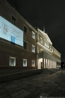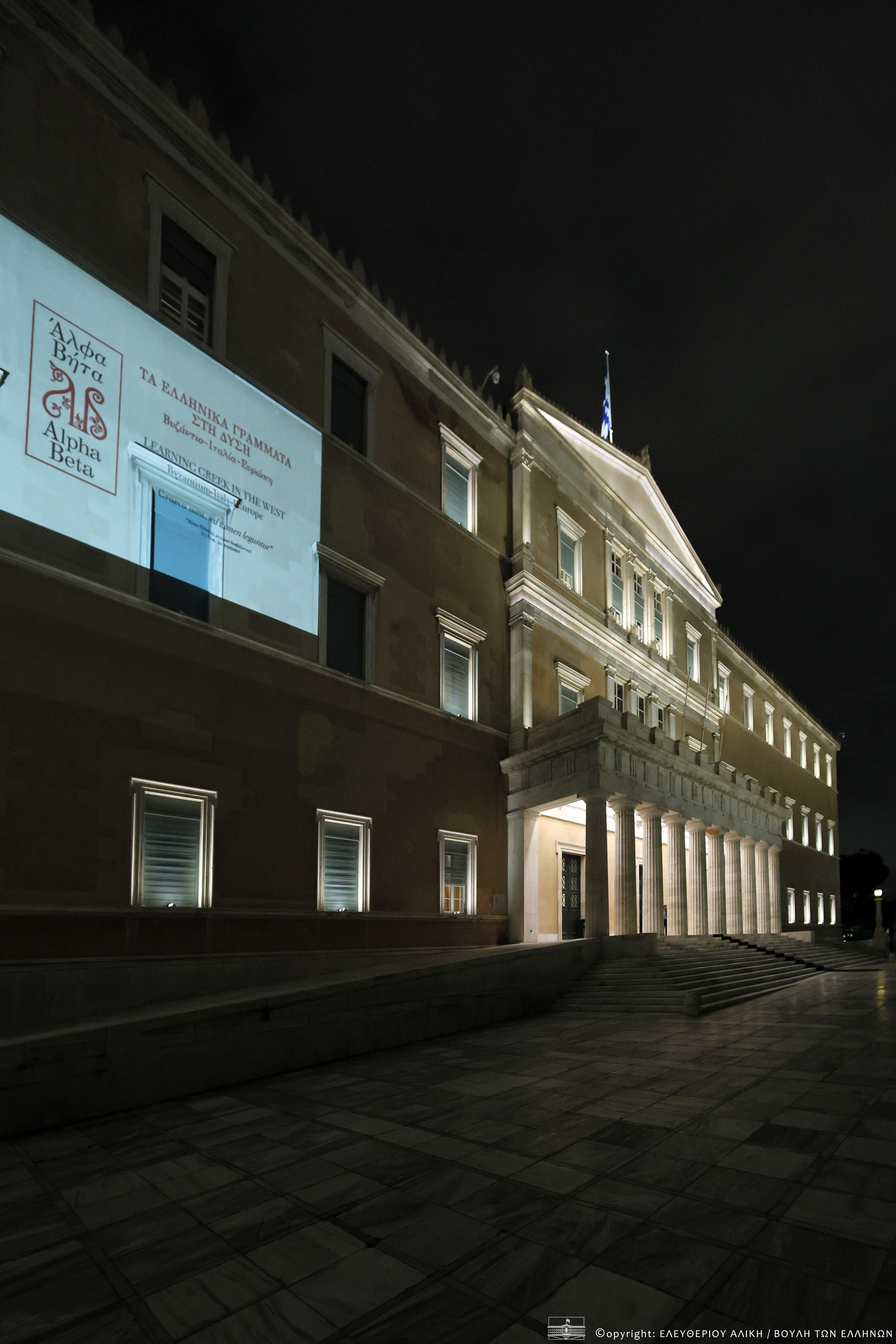Στο πλαίσιο της καθιέρωσης της 9ης Φεβρουαρίου ως Παγκόσμιας Ημέρας Ελληνικής Γλώσσας, φωταγωγήθηκε η πρόσοψη του Μεγάρου της Βουλής.