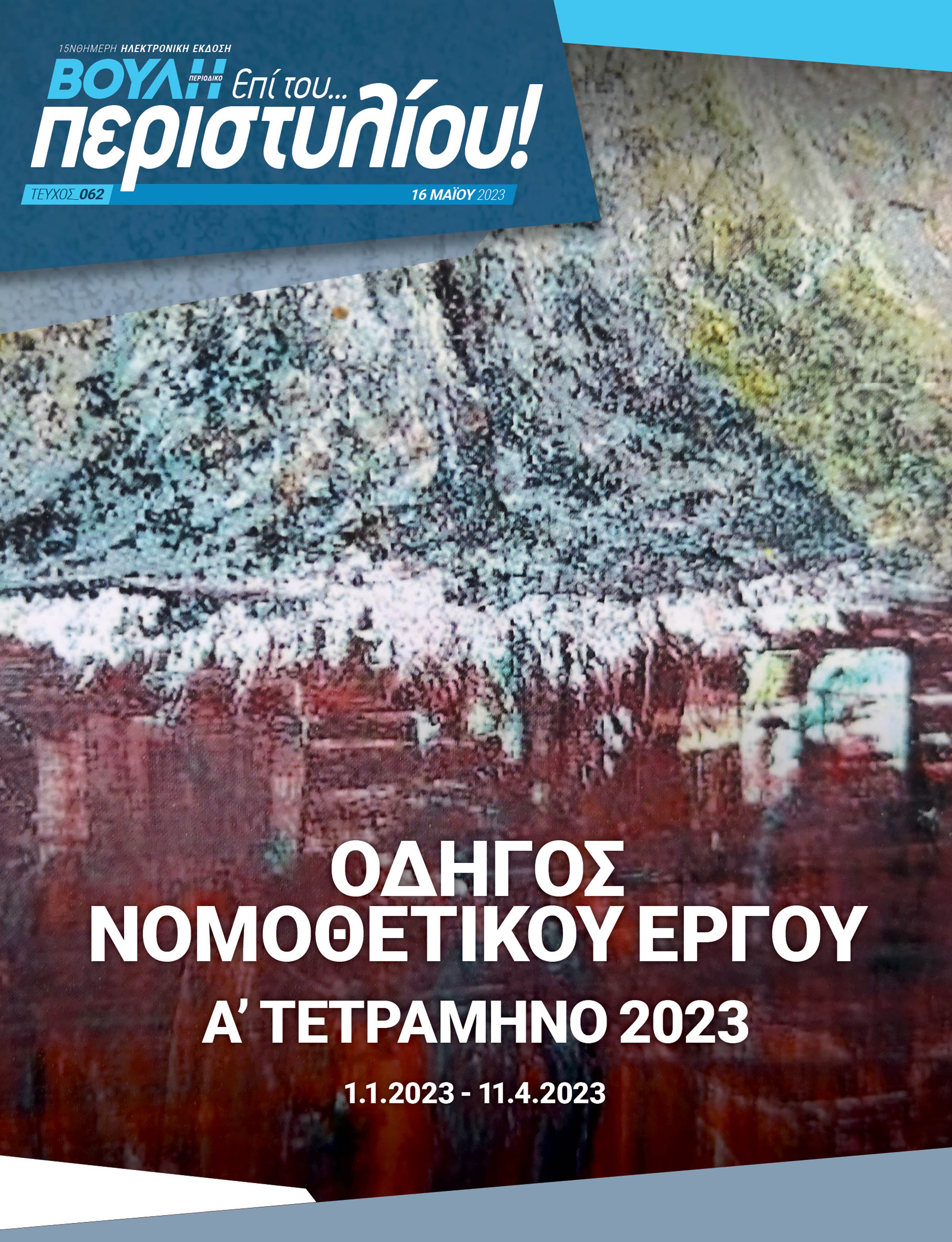 Το νομοθετικό έργο του πρώτου τετραμήνου του 2023, της ΙΗ' Κοινοβουλευτικής Περιόδου, παρουσιάζεται στο νέο, 62ο τεύχος του ηλεκτρονικού περιοδικού «Επί του… περιστυλίου!» που αναρτήθηκε σήμερα στον Ιστότοπο του Κοινοβουλίου.