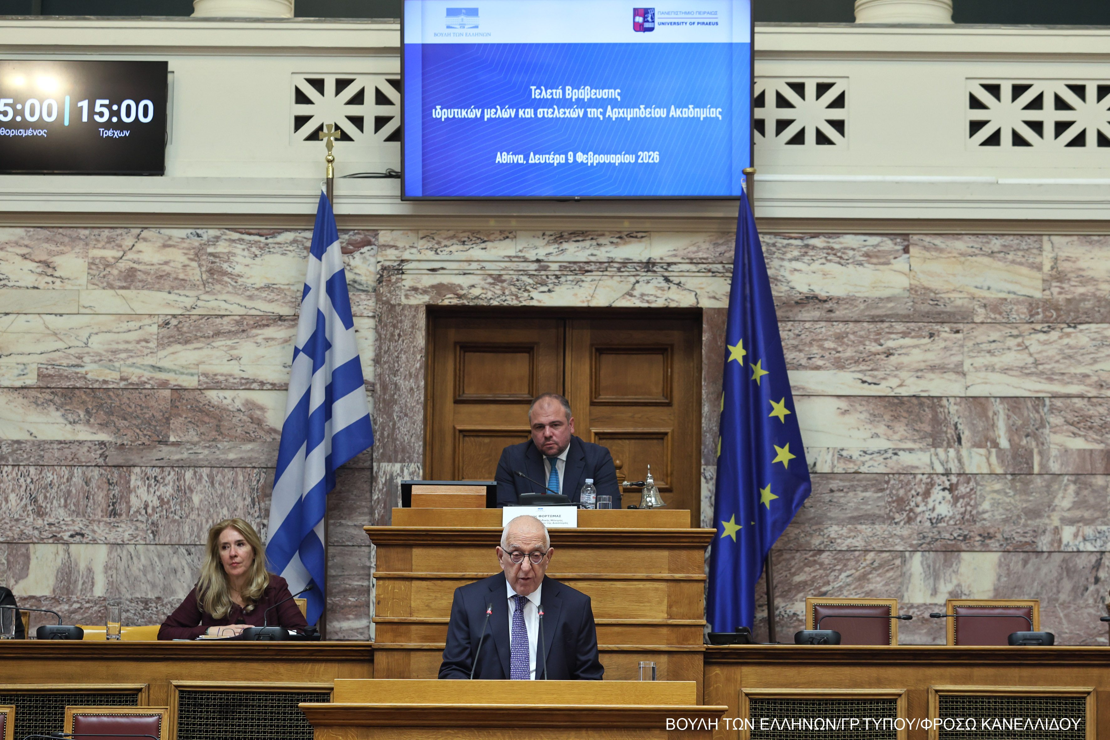 Αυτό επισήμανε ο Πρόεδρος της Βουλής των Ελλήνων κ. Νικήτας Κακλαμάνης σε ειδική εκδήλωση που πραγματοποιήθηκε στην Αίθουσα της Γερουσίας στο Κοινοβούλιο όπου βραβεύτηκαν ο Πρόεδρος και τα μέλη του Δ.Σ. της Αρχιμηδείου Ακαδημίας για τη συμβολή τους στην προώθηση και διάδοση της ελληνικής γλώσσας στη Διασπορά.