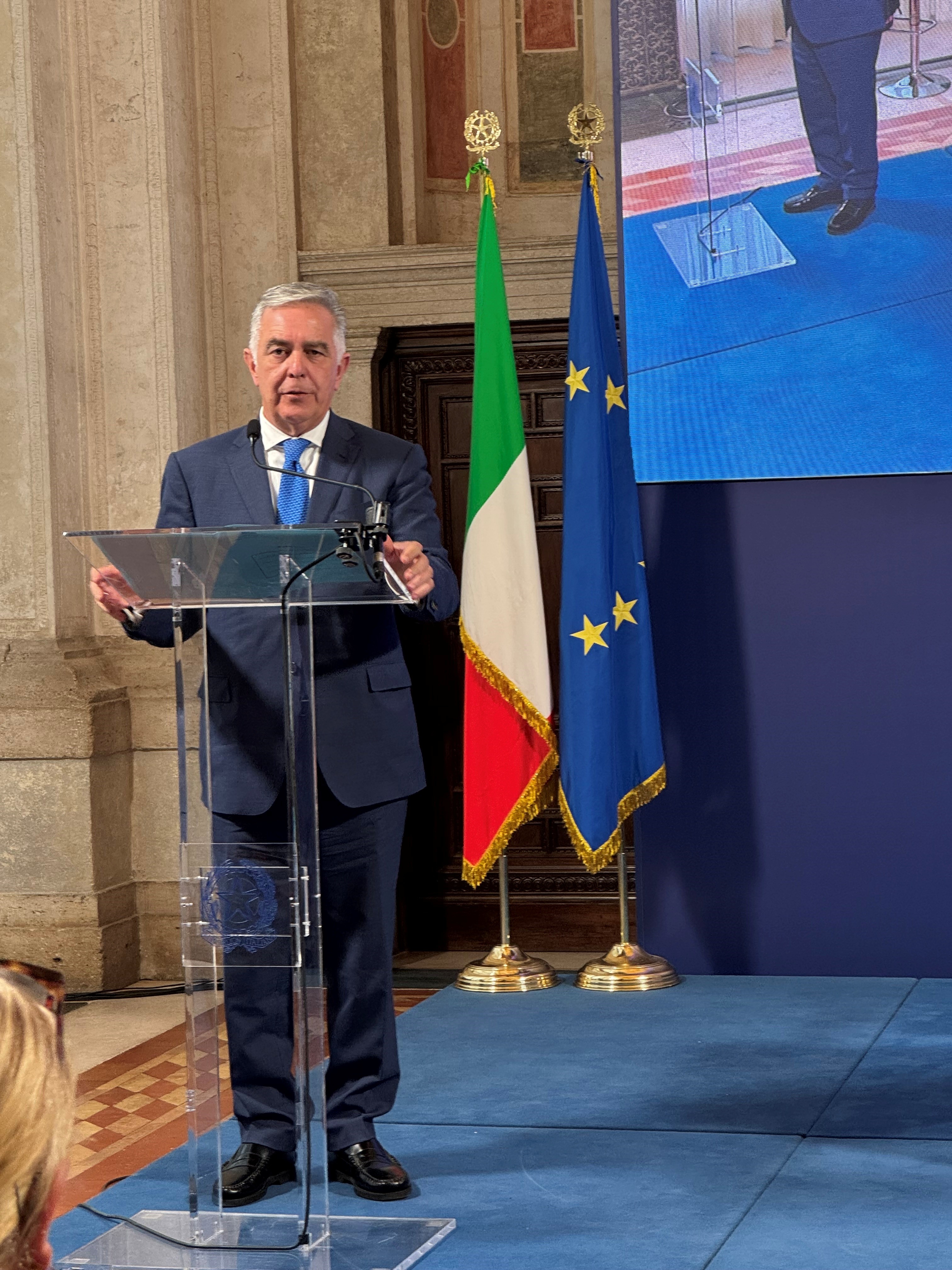 Παράλληλα, εξήγησε και τη δική του σχέση με την Ιταλική γλώσσα, λέγοντας χαρακτηριστικά: «Η καταγωγή μου από τη Ρόδο με συνδέει με τη γλώσσα σας. Για δεκαετίες, στη διάρκεια της ιταλικής κατοχής της Δωδεκανήσου τα ιταλικά μιλιόντουσαν από τους παππούδες και τους γονείς μας. Μολονότι αυτή υπήρξε μια ευαίσθητη ιστορική περίοδος για την πατρίδα μου, σήμερα την αντιλαμβάνομαι ως μια γέφυρα που συνδέει δύσκολες αναμνήσεις με ένα παρόν φιλίας, συνεργασίας και αμοιβαίου σεβασμού».
