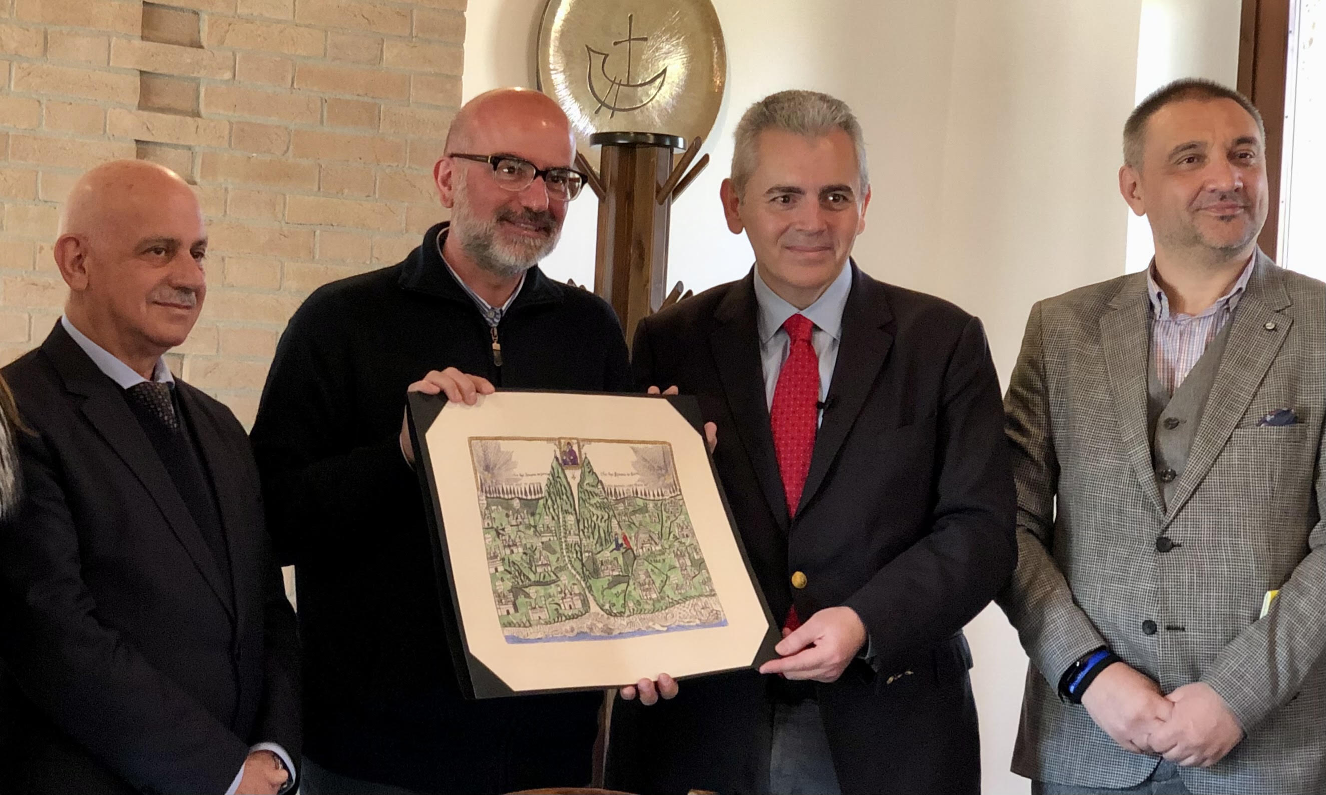 Ο Μάξιμος Χαρακόπουλος προσφέρει στον ηγούμενο της Μονής Μπόζε γκραβούρα με τις Ι. Μονές του Αγίου Όρους.