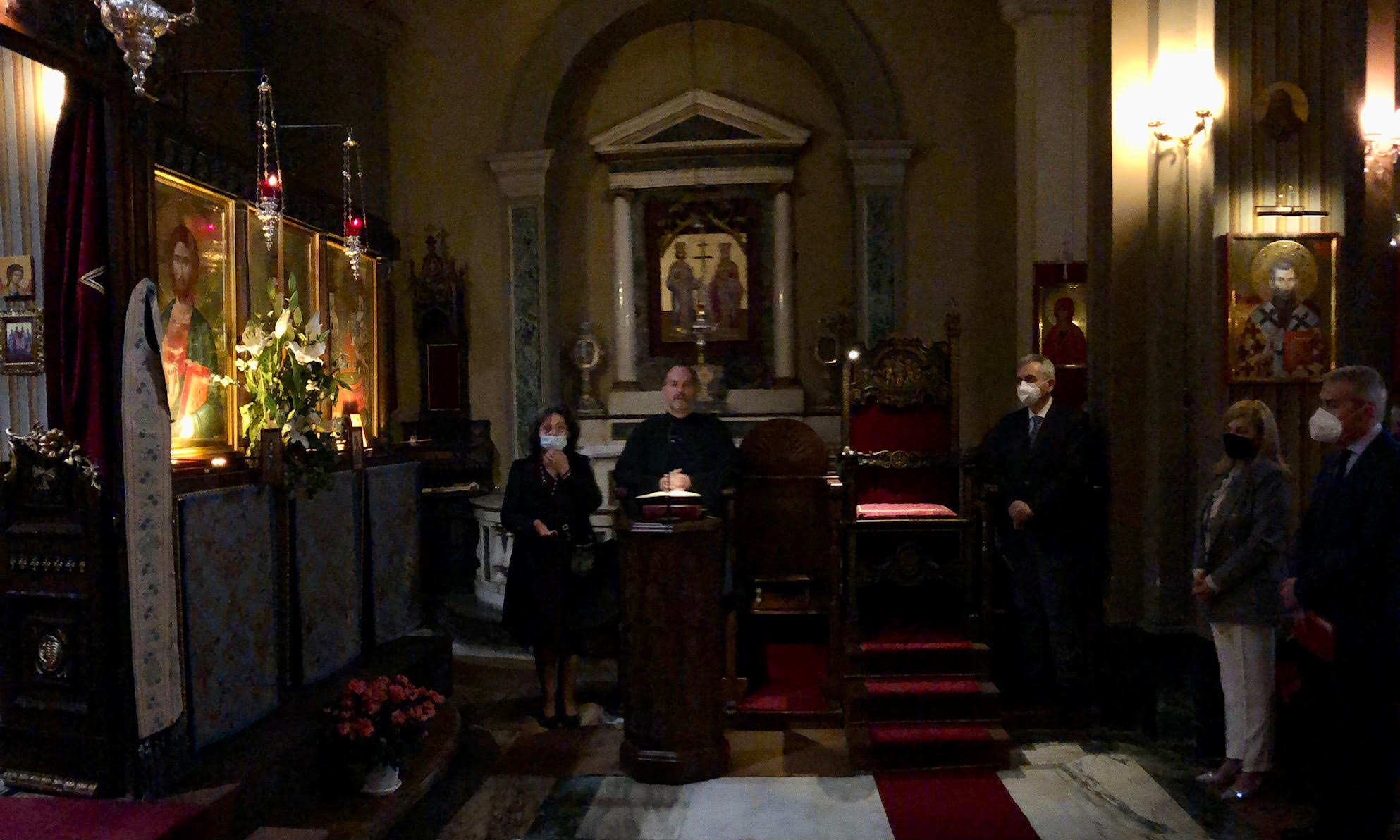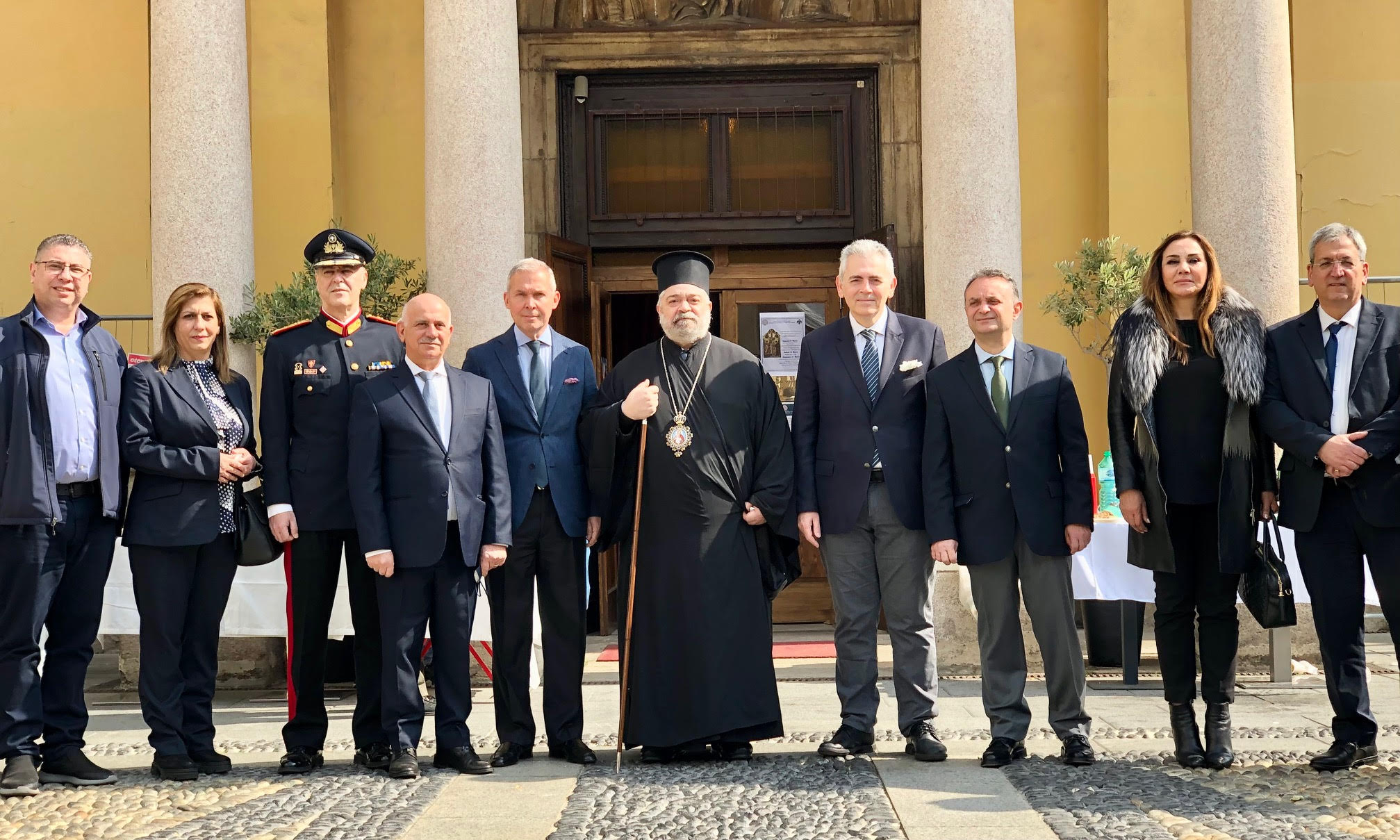 Η ηγεσία της ΔΣΟ και εκπρόσωποι αρχών με τον μητροπολίτη Ιταλίας μετά τη δοξολογία για την εθνική μας εορτή.