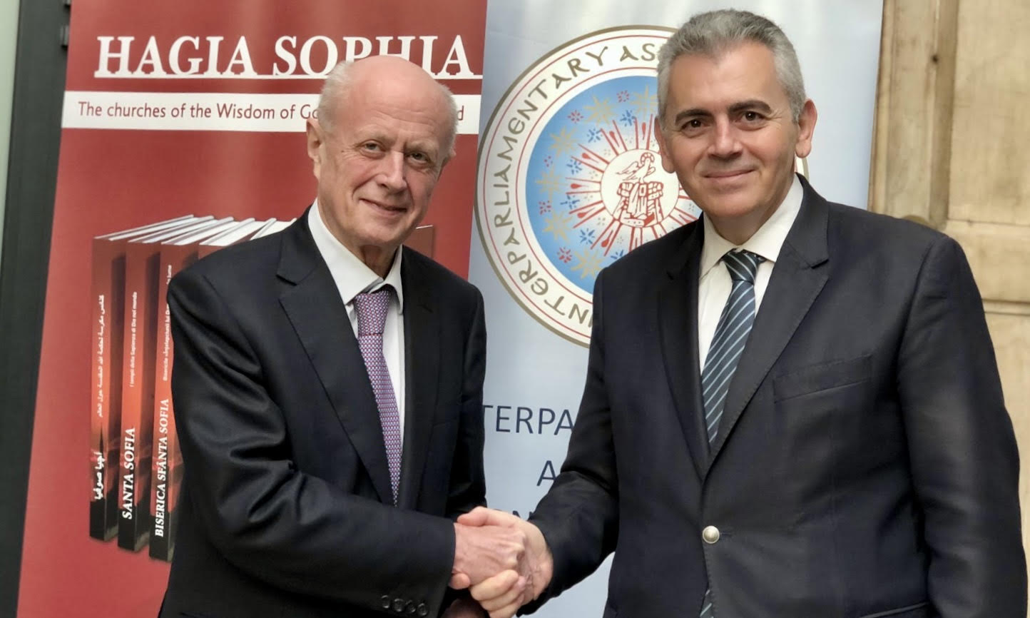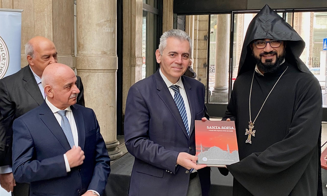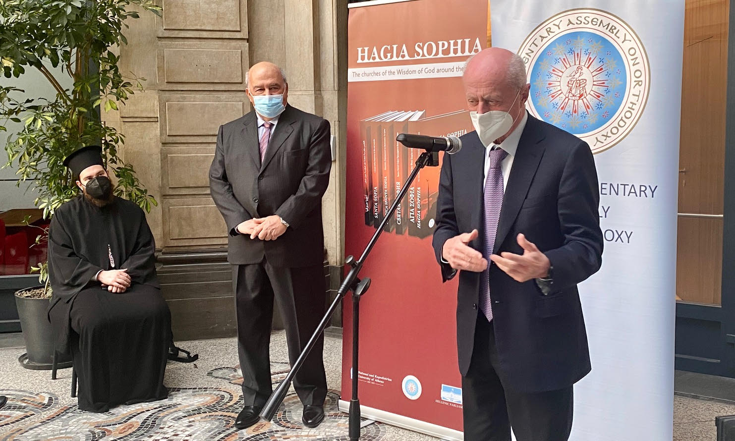 Ο επικεφαλής της ΔΣΟ στηλίτευσε την «ασεβή ενεργεία» της μετατροπής της Αγίας Σοφίας σε τέμενος, υποστηρίζοντας ότι «η πολιτισμένη ανθρωπότητα δεν πρέπει να σταθεί βουβή απέναντι σε μια τέτοια παραβίαση βασικών αξιών του πολιτισμού μας και την καταπάτηση ακόμη και διεθνών κανόνων. Διότι το μοναδικό αυτό μνημείο περιλαμβάνεται από το 1985 στον Κατάλογο των Μνημείων της Παγκόσμιας Πολιτιστικής Κληρονομιάς της UNESCO. Μέχρι τώρα, οι αντιδράσεις στην ασεβή αυτή πράξη της Τουρκίας δεν ήταν οι αναμενόμενες. Κι αυτό πρέπει να μας προβληματίσει για το κατά πόσο είμαστε διατεθειμένοι ως Ευρωπαίοι να υπερασπιζόμαστε τις αξίες μας. Ως ΔΣΟ από την πρώτη στιγμή προσπαθήσαμε να αφυπνίσουμε την διεθνή κοινότητα. Και στο πλαίσιο αυτό εκδώσαμε και τον παρόντα τόμο. Είμαστε δε ιδιαίτερα ικανοποιημένοι που η δεύτερη επίσημη παρουσίαση του τόμου γίνεται στην Ιταλία.