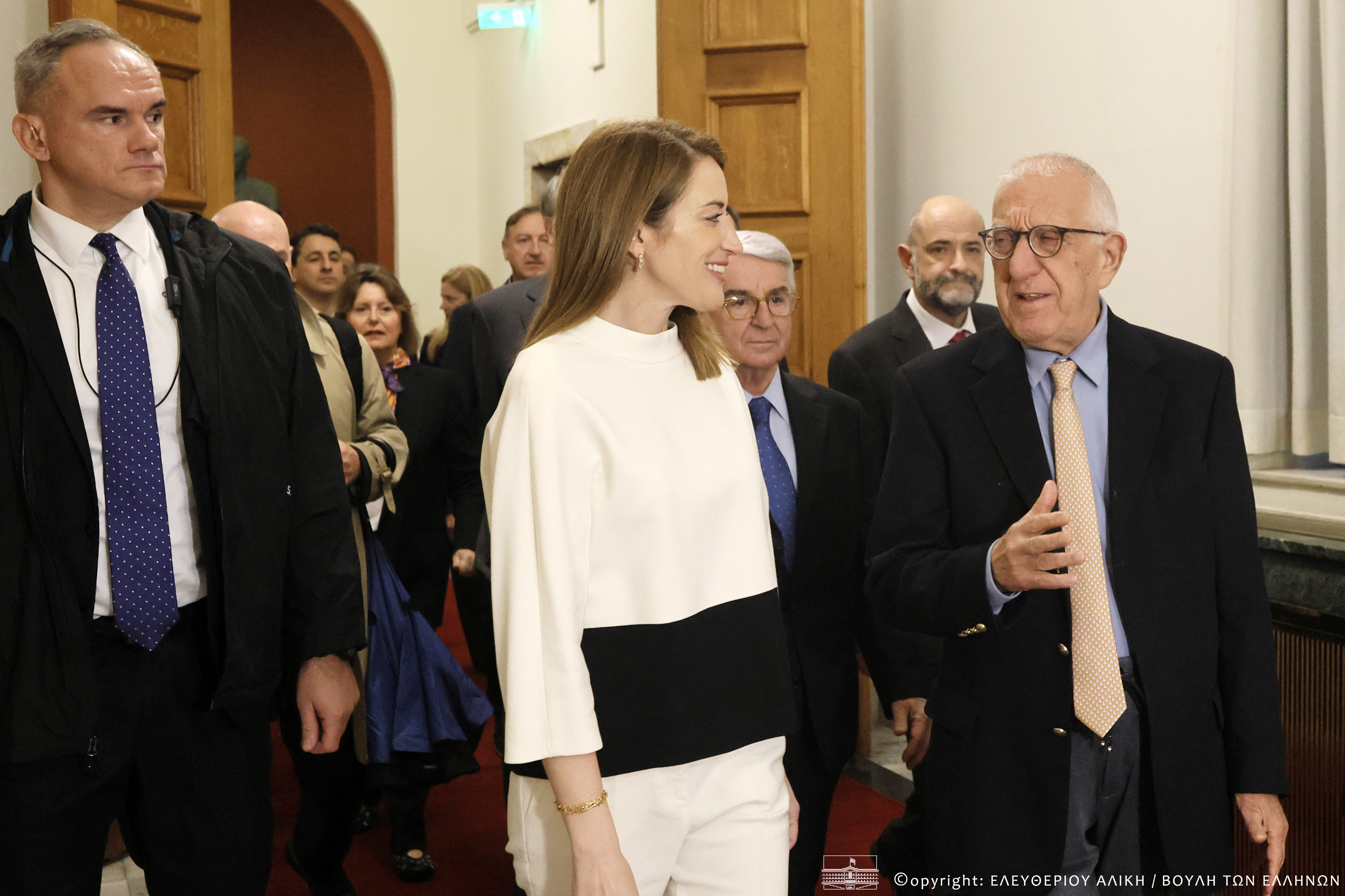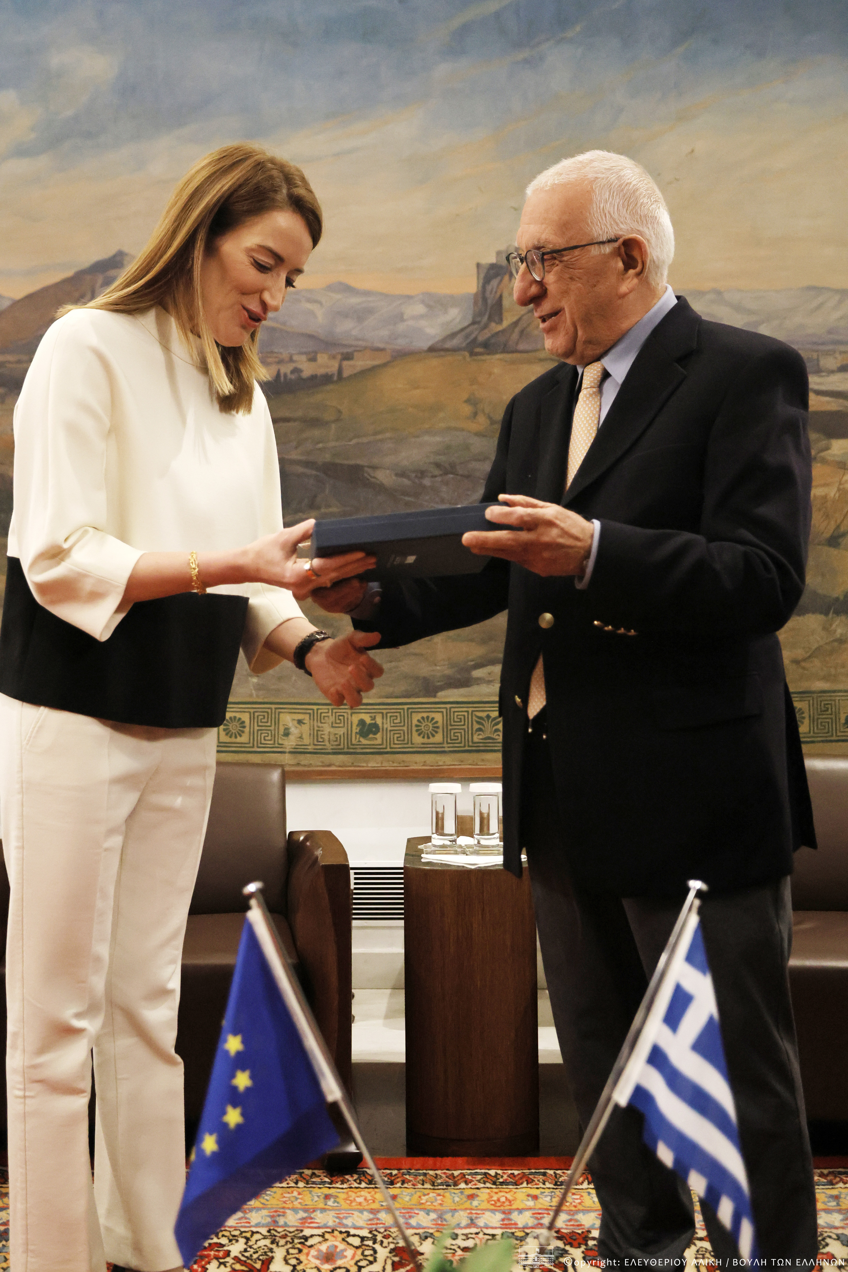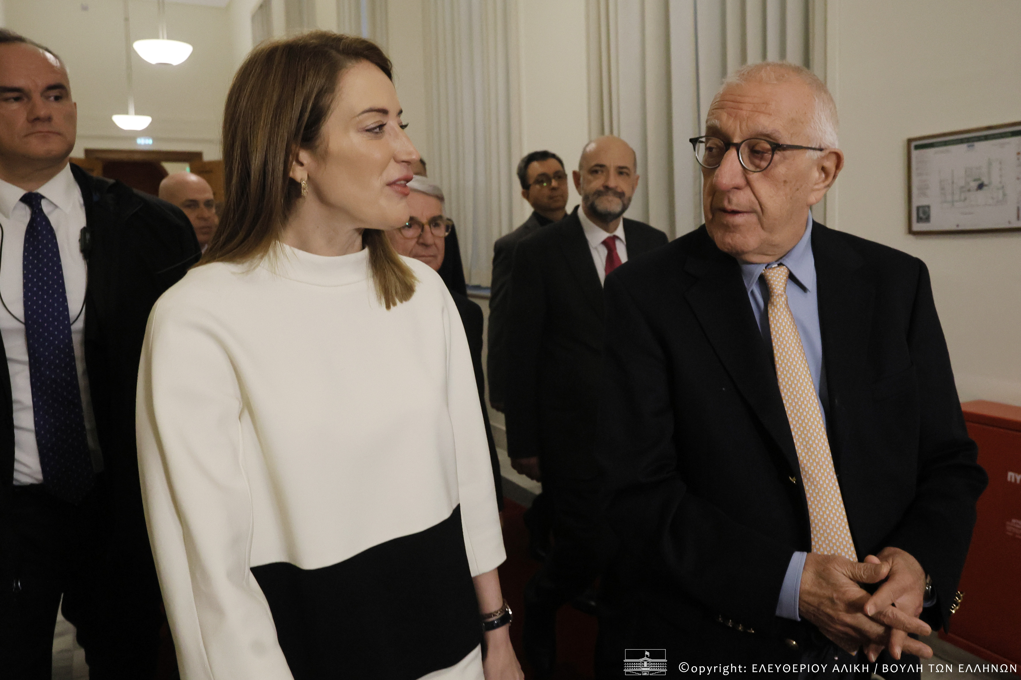 Από την πλευρά της, η Πρόεδρος του Ευρωπαϊκού Κοινοβουλίου αφού πρώτα ευχαρίστησε τον Πρόεδρο της Βουλής για την υποδοχή, υπενθύμισε τον αντίκτυπο που άφησε ο κ. Ν. Κακλαμάνης στο Ευρωπαϊκό Κοινοβούλιο, τα χρόνια που υπήρξε μέλος του.