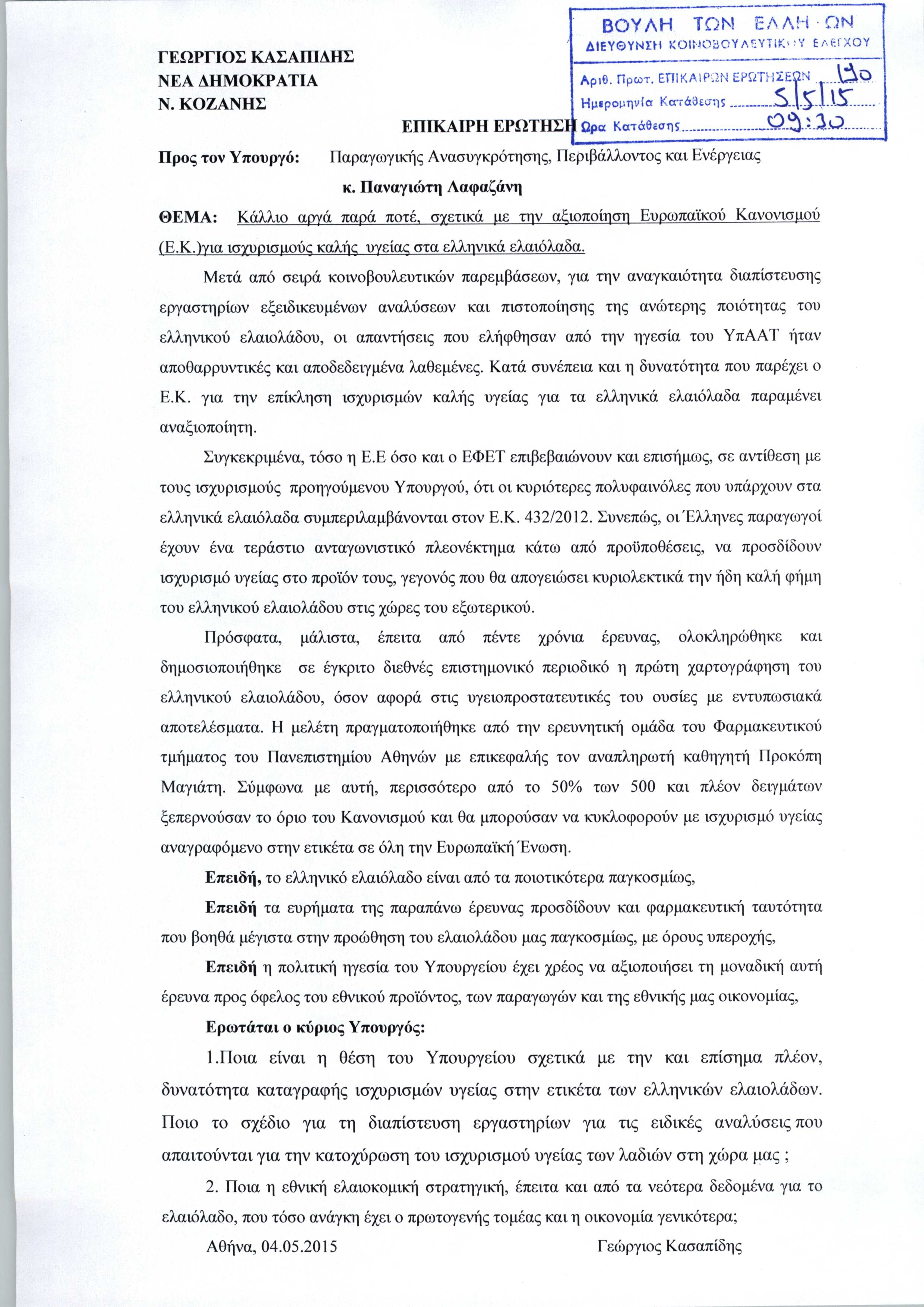 - Σχετικά με την αξιοποίηση Ευρωπαϊκού Κανονισμού (Ε.Κ.) για ισχυρισμούς καλής υγείας στα ελληνικά ελαιόλαδα