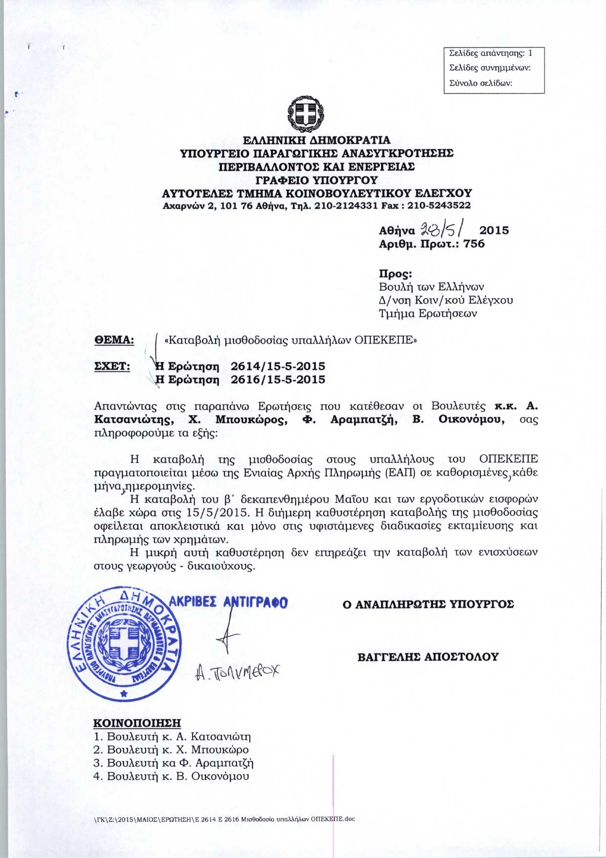 - Λαφαζάνης Παναγιώτης (Υπουργός Παραγωγικής Ανασυγκρότησης, Περιβάλλοντος και Ενέργειας)