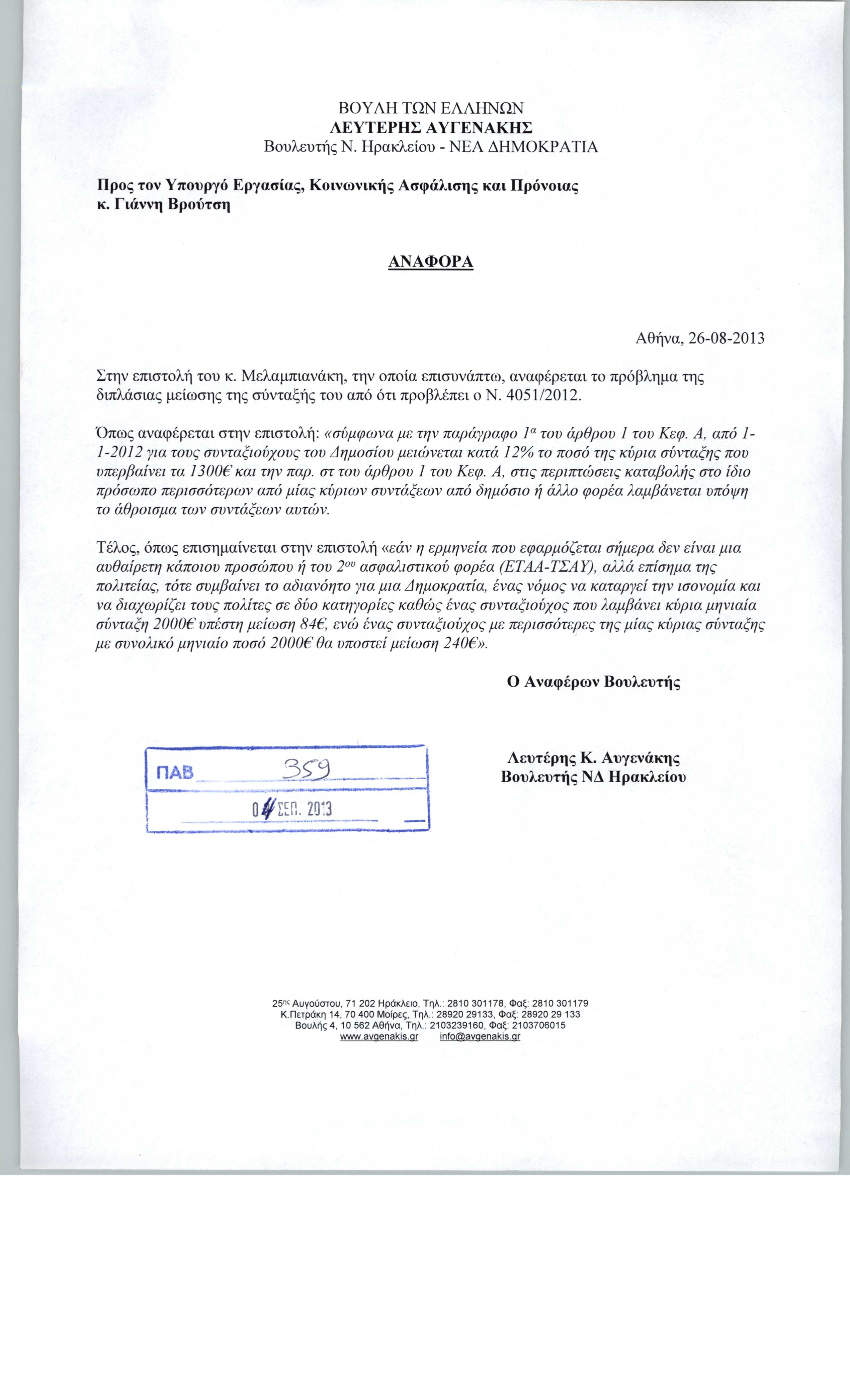 - διαμαρτύρεται για τη διπλάσια μείωση της σύνταξής του από ότι προβλέπει ο ν.4051/2012.