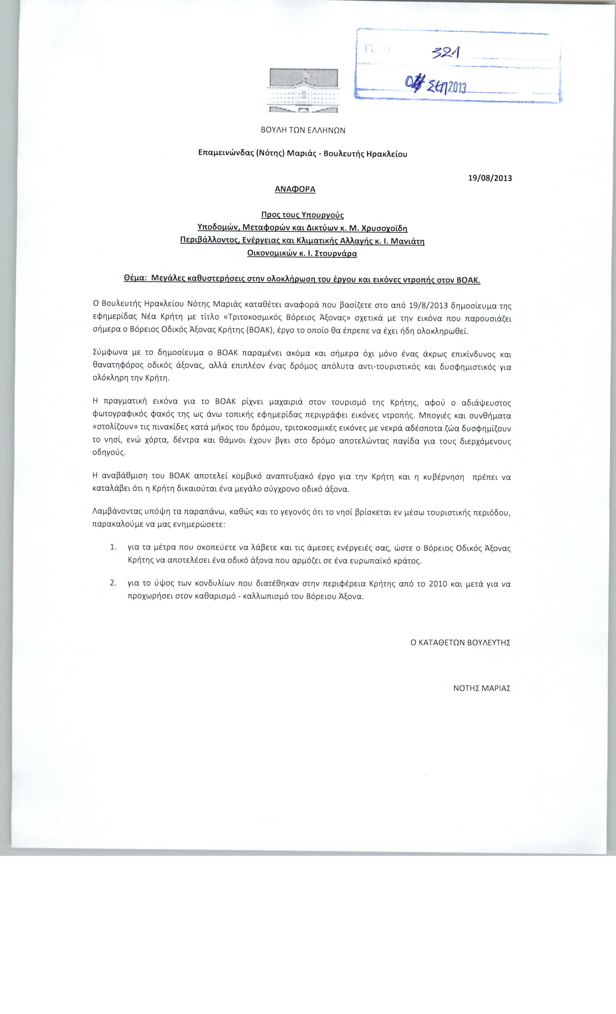 - το οποίο αφορά σε καθυστερήσεις στην ολοκλήρωση του έργου κατασκευής του Βόρειου Οδικού Άξονα στην Κρήτη.