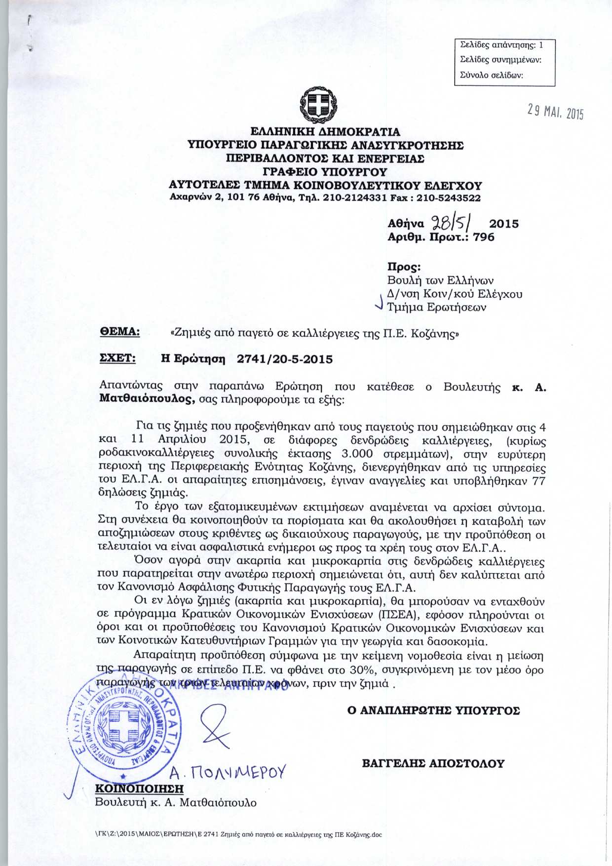 - Καταβολές αποζημιώσεων λόγω παγετού στους ροδακινοπαραγωγούς της Κοζάνης και σε περιπτώσεις μερικής καταστροφής καρπών