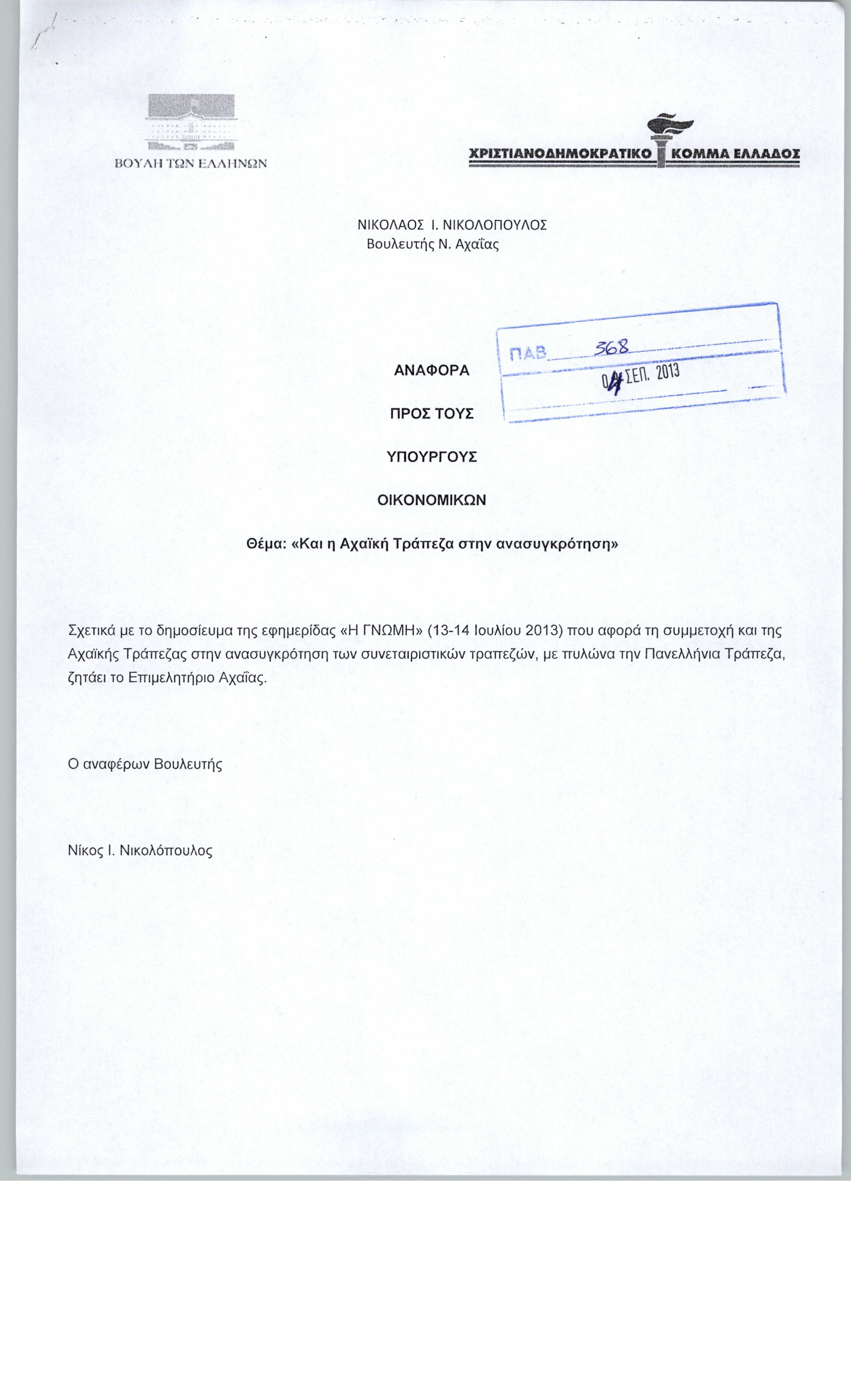 - το οποίο αφορά αίτημα του Επιμελητηρίου Αχαϊας να συμμετάσχει και η Αχαϊκή Τράπεζα στην ανασυγκρότηση των συνεταιριστικών Τραπεζών, με πυλώνα την Πανελλήνια Τράπεζα.
