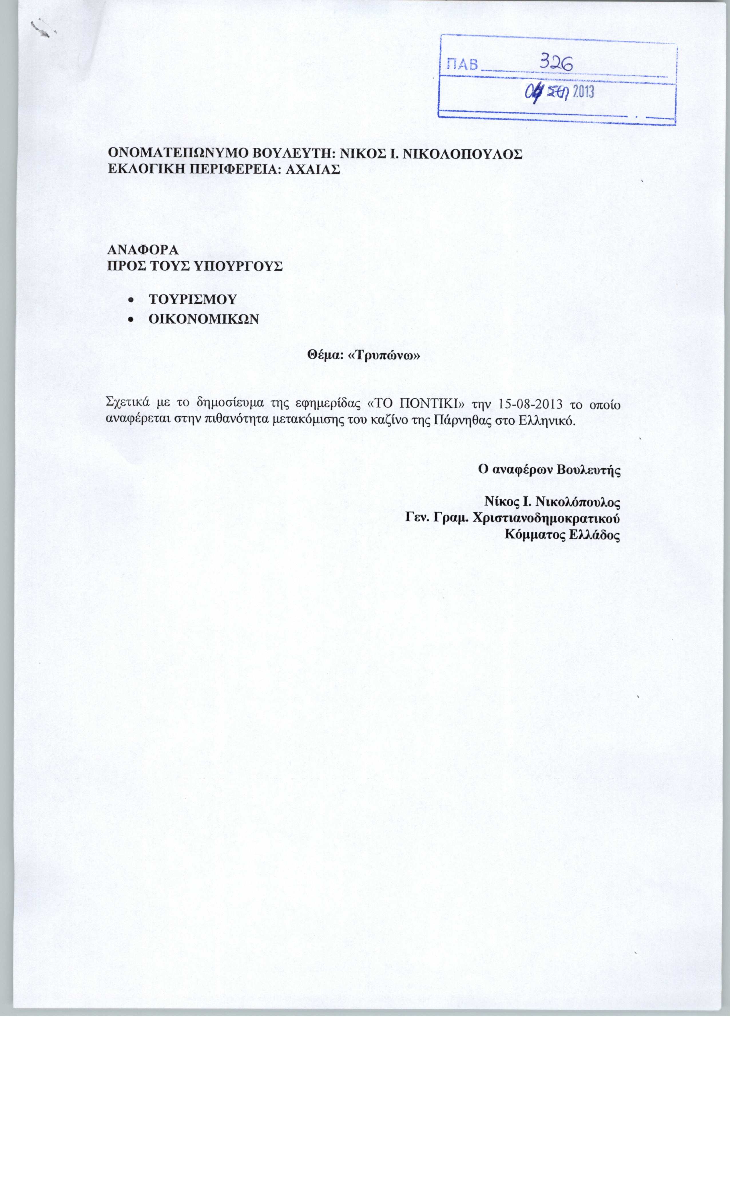 - το οποίο αναφέρεται στην πιθανότητα μετακόμισης του καζίνο της Πάρνηθας στο Ελληνικό.