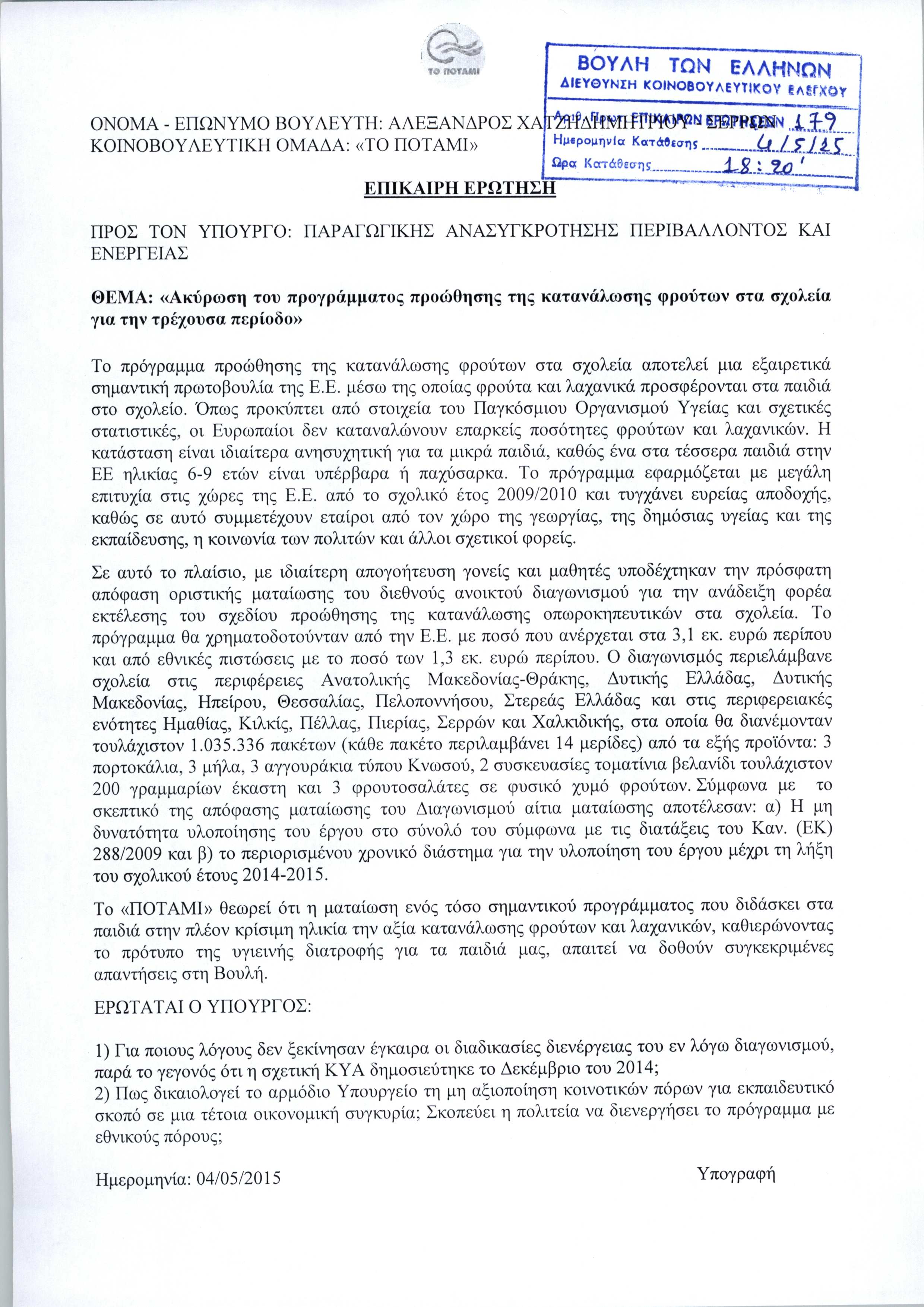 - Σχετικά με την ακύρωση του προγραμματος προώθησης της κατανάλωσης φρούτων στα σχολεία την τρέχουσα περίοδο