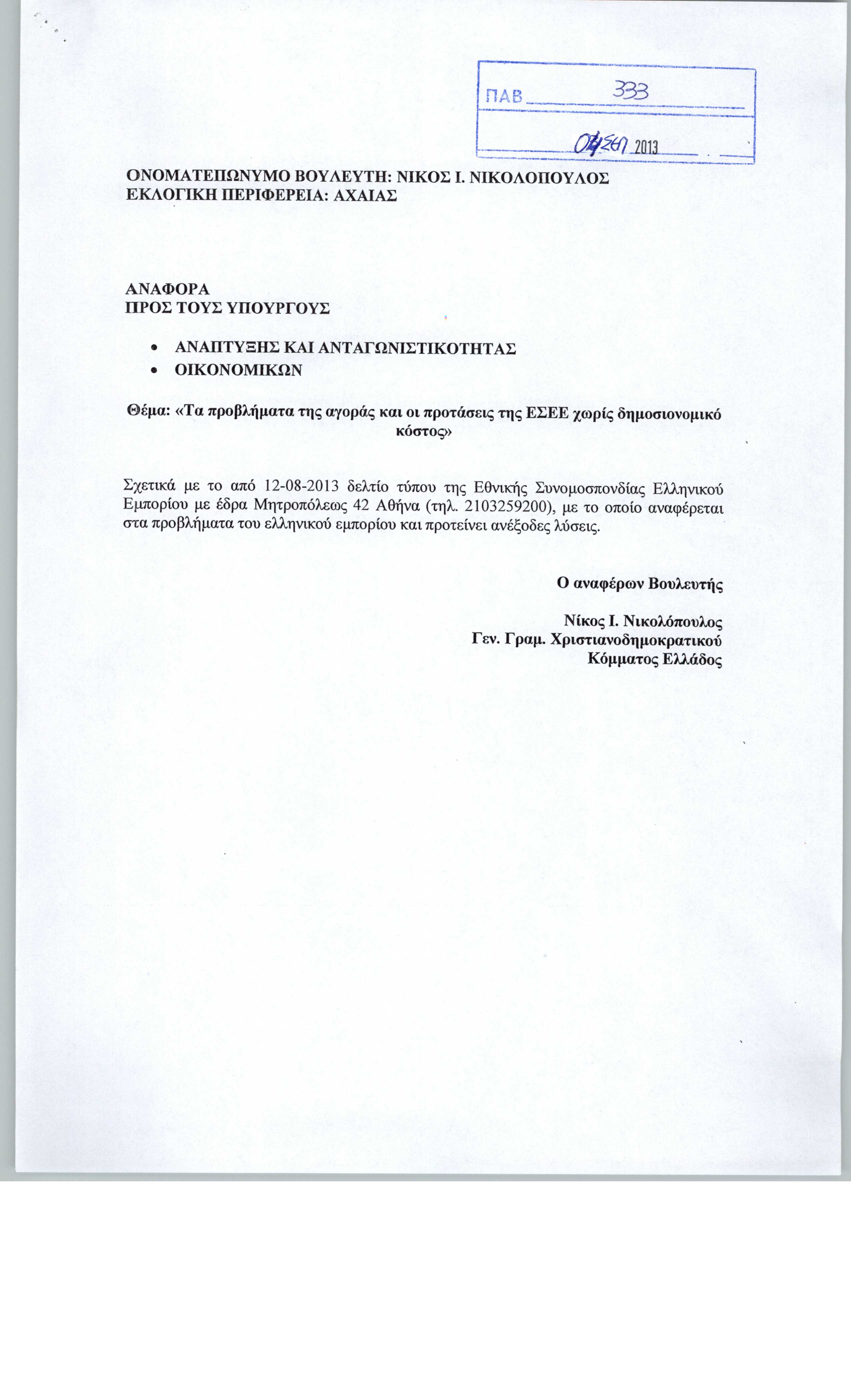 - αιτείται την υιοθέτηση προτάσεών της για την επίλυση των προβλημάτων του ελληνικού εμπορίου χωρίς δημοσιονομικό κόστος.