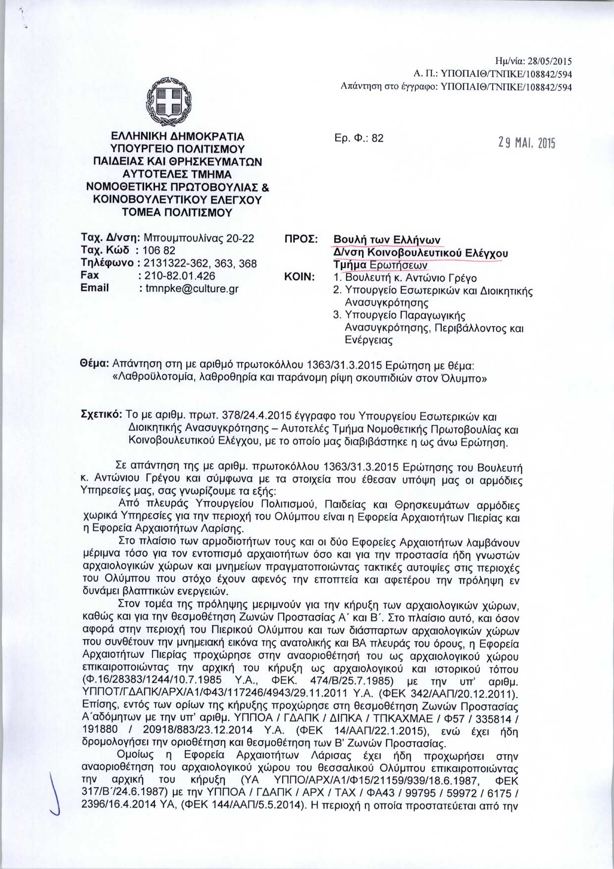 - Λαθροϋλοτομία, λαθροθηρία και παράνομη ρίψη σκουπιδιών στον Όλυμπο