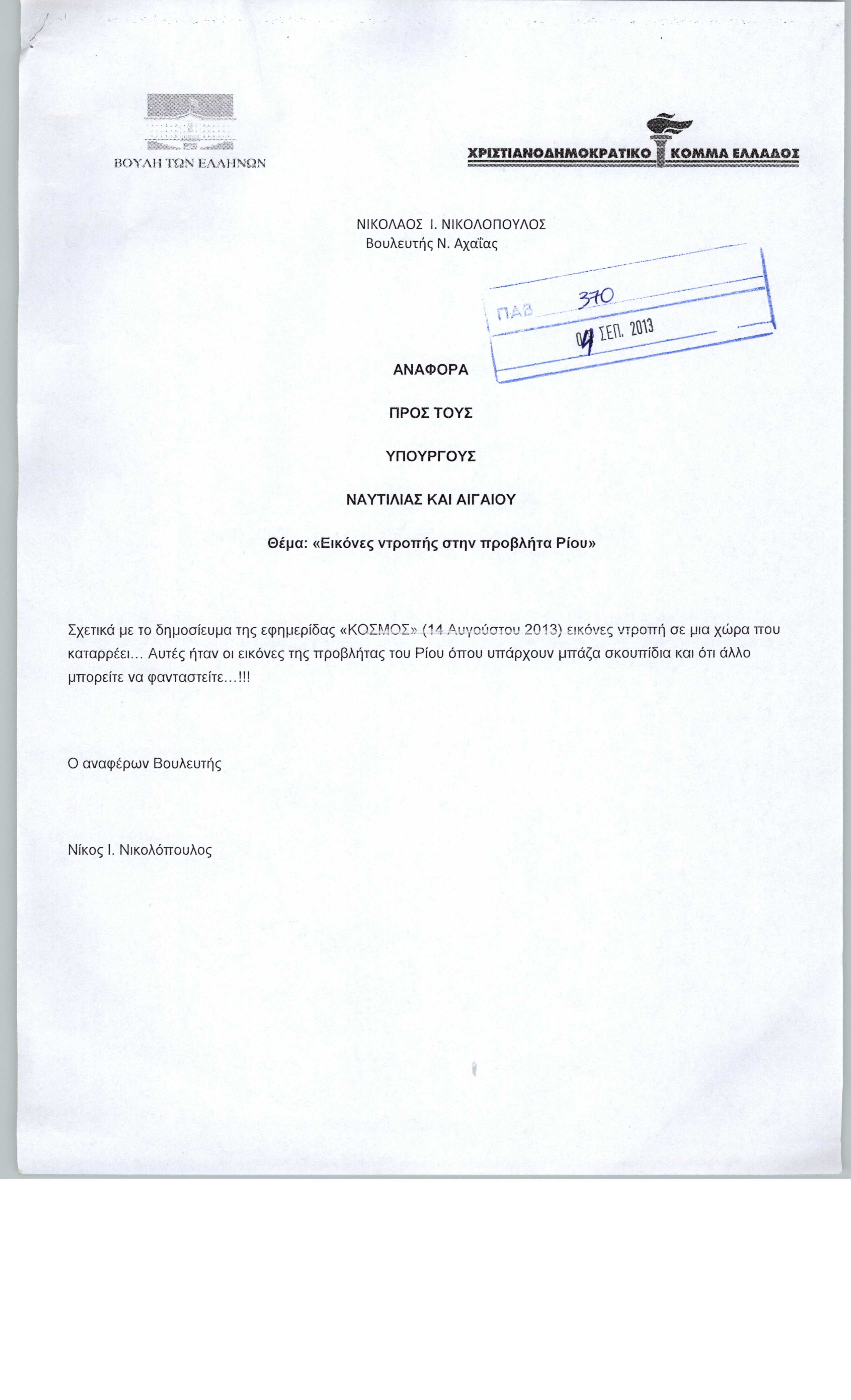 - το οποίο αφορά την εικόνα ντροπής που παρουσιάζει η προβλήτα του Ρίου.