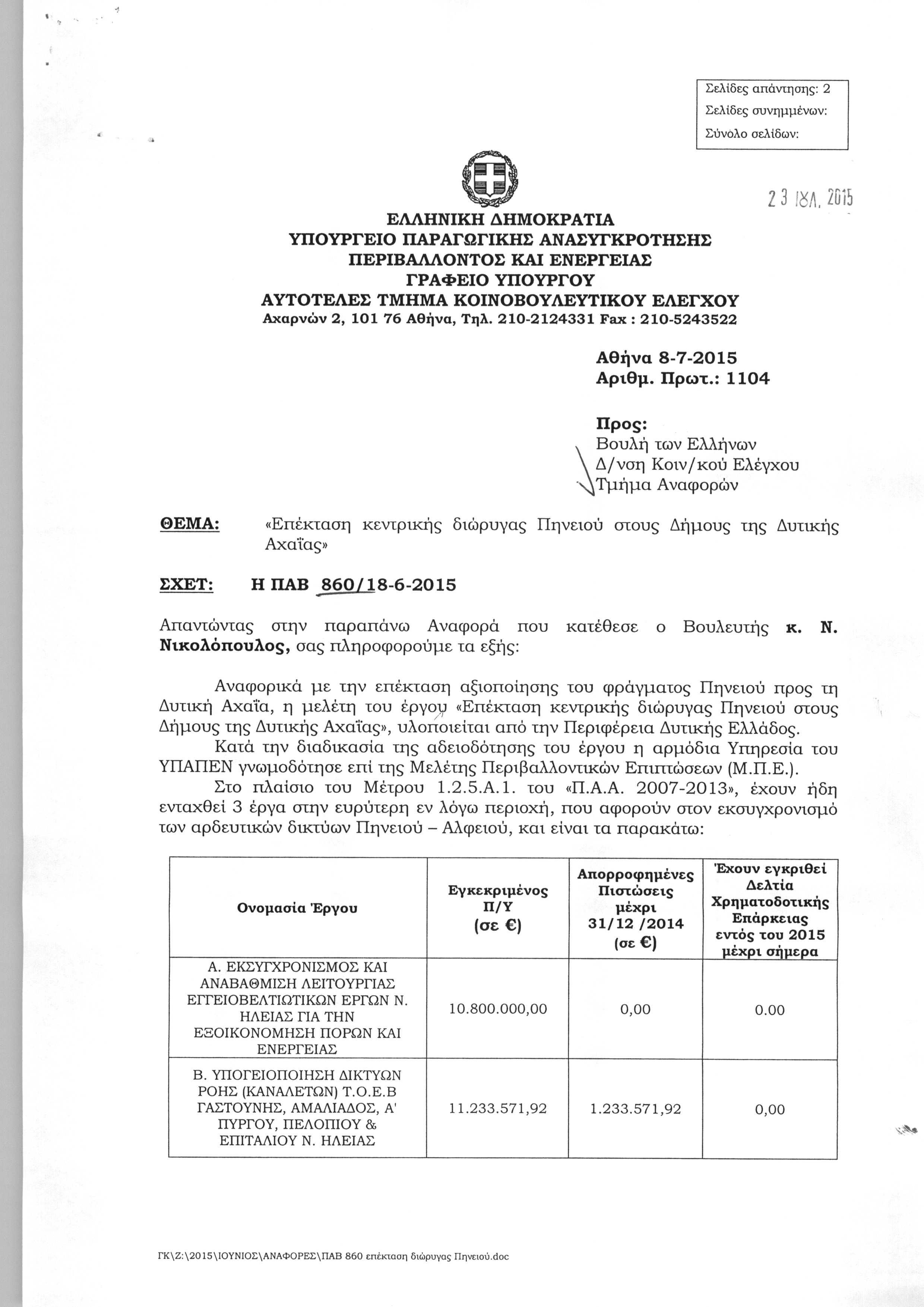- επί του συνημμένου δημοσιεύματος της εφημερίδας «Η ΑΞΙΑ» έκδοσης 12/5/2015 σχετικά με το αίτημα φορέων και κατοίκων της Δυτικής Αχαΐας για επέκταση προς τα Βορειοανατολικά (ΒΑ) της αρδευτικής διώρυγας του φράγματος του Πηνειού.