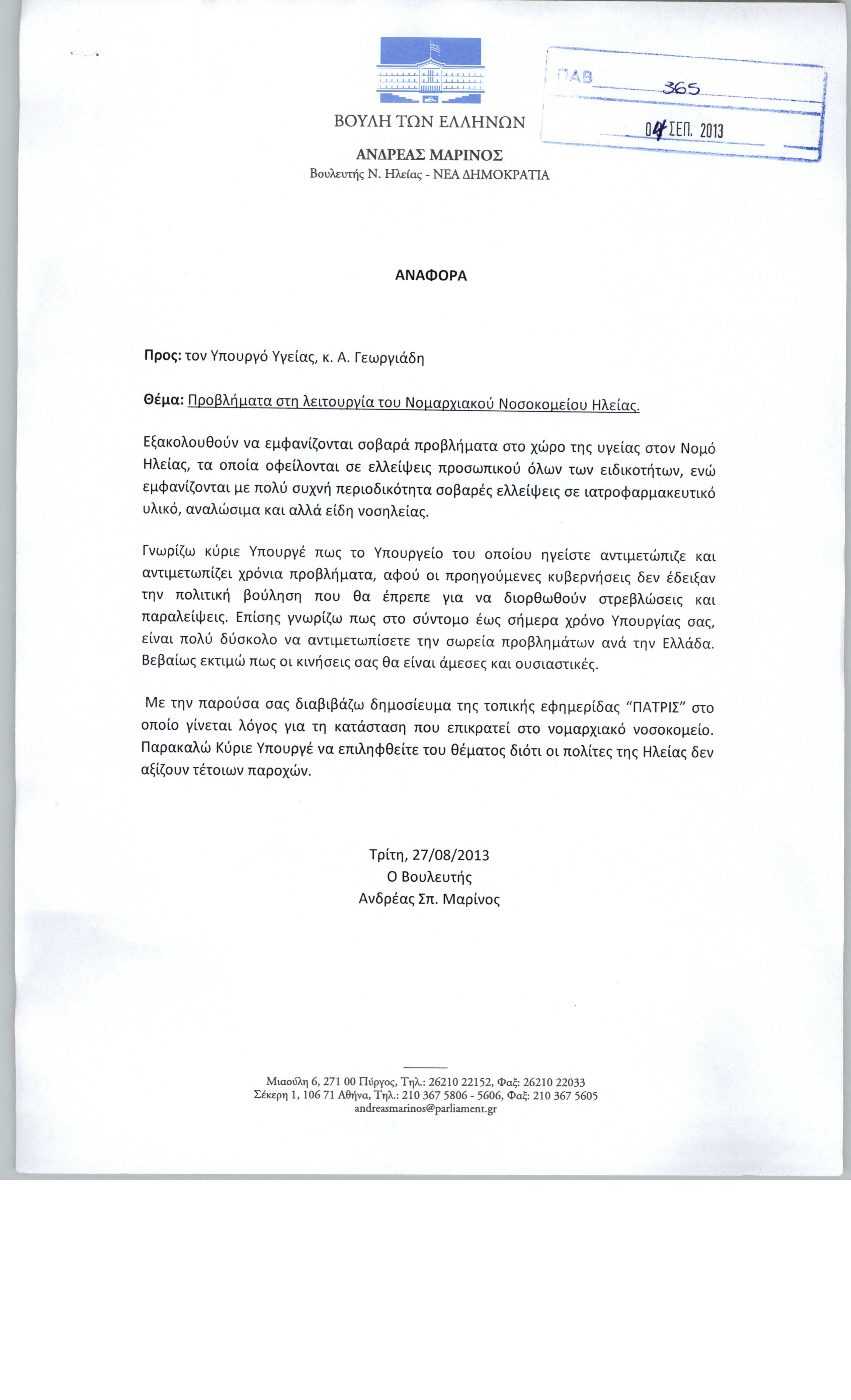 - το οποίο αφορά προβλήματα στη λειτουργία του Νομαρχιακού Νοσοκομείου Ηλείας.