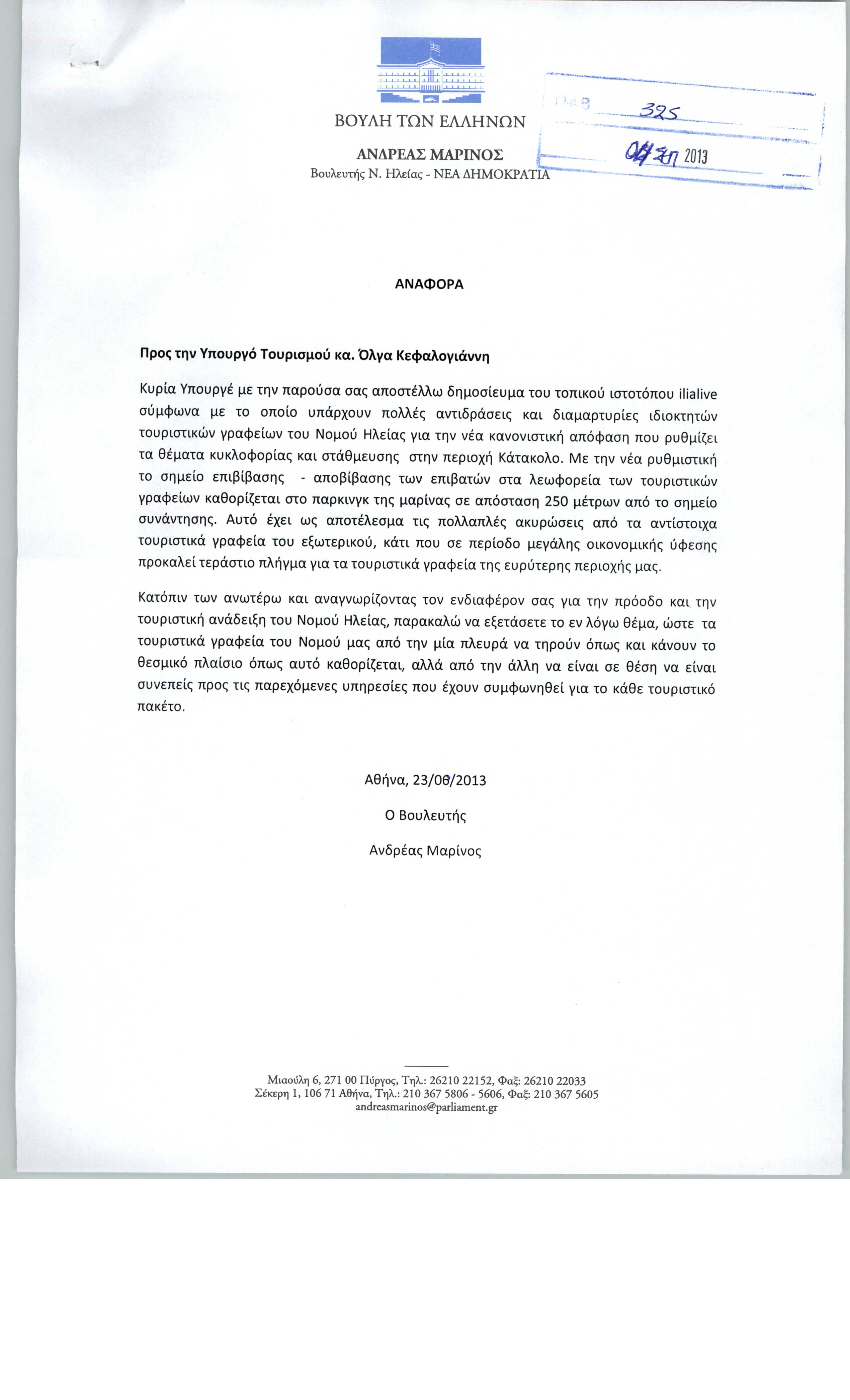 - το οποίο αφορά διαμαρτυρίες των ιδιοκτητών τουριστικών γραφείων του Νομού Ηλείας για τη νέα κανονιστική απόφαση που ρυθμίζει θέματα κυκλοφορίας και στάθμευσης στην περιοχή του Κατάκολου.