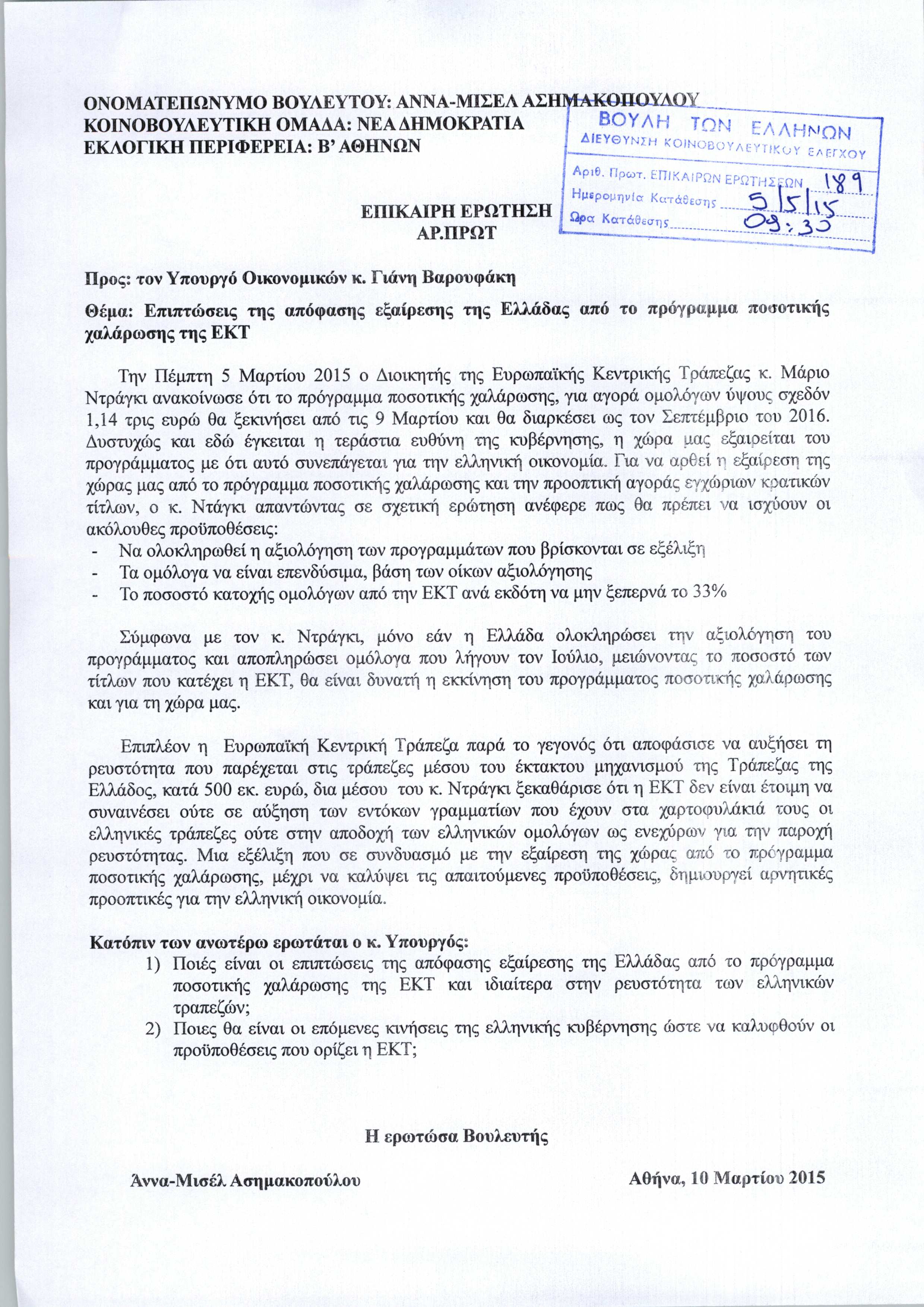 - Σχετικά με τις επιπτώσεις της απόφασης εξαίρεσης της Ελλάδας από το πρόγραμμα ποσοτικής χαλάρωσης της ΕΚΤ