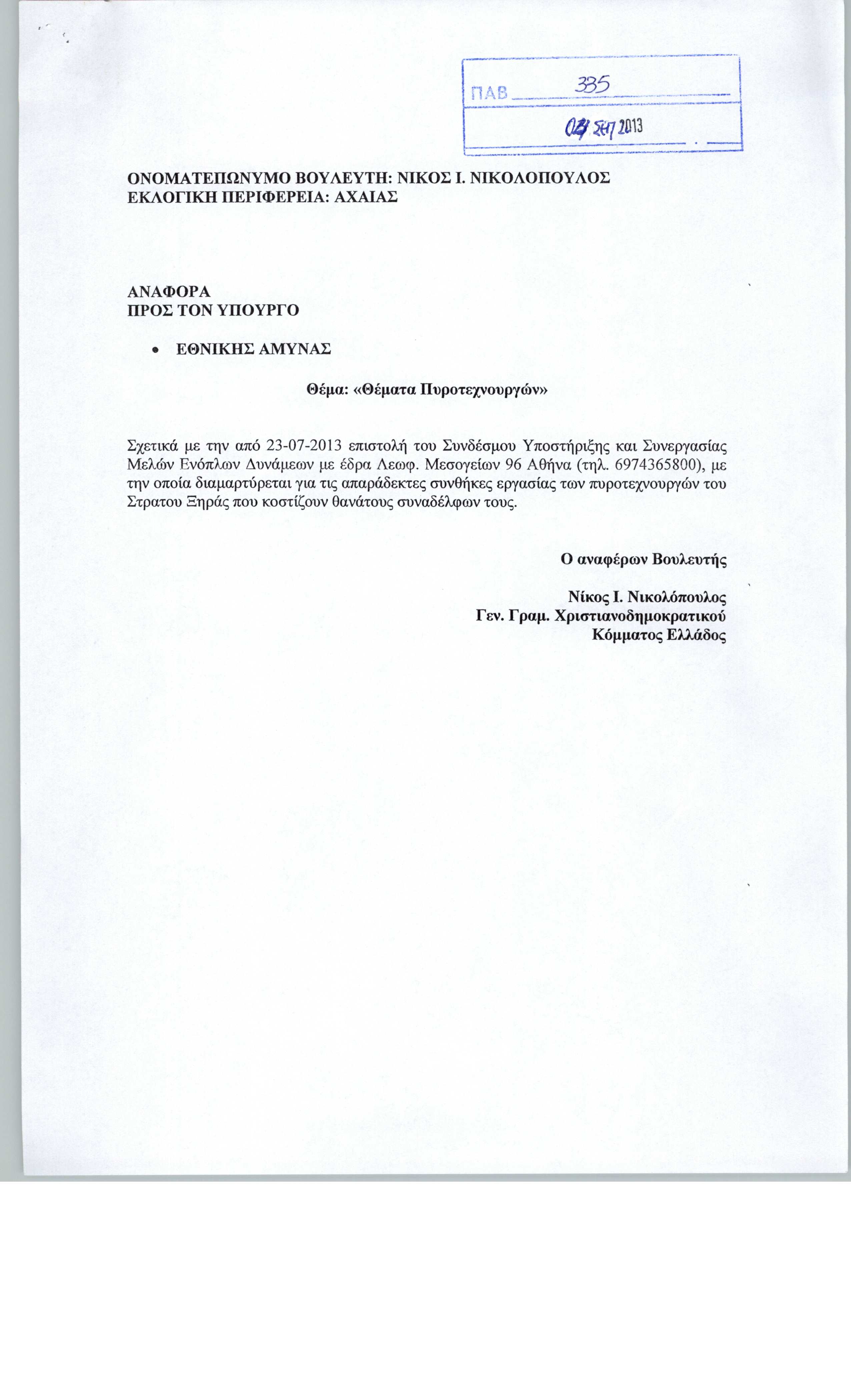 - εκφράζει τη διαμαρτυρία του για τις απαράδεκτες συνθήκες εργασίας των πυροτεχνουργών του Στρατού Ξηράς.