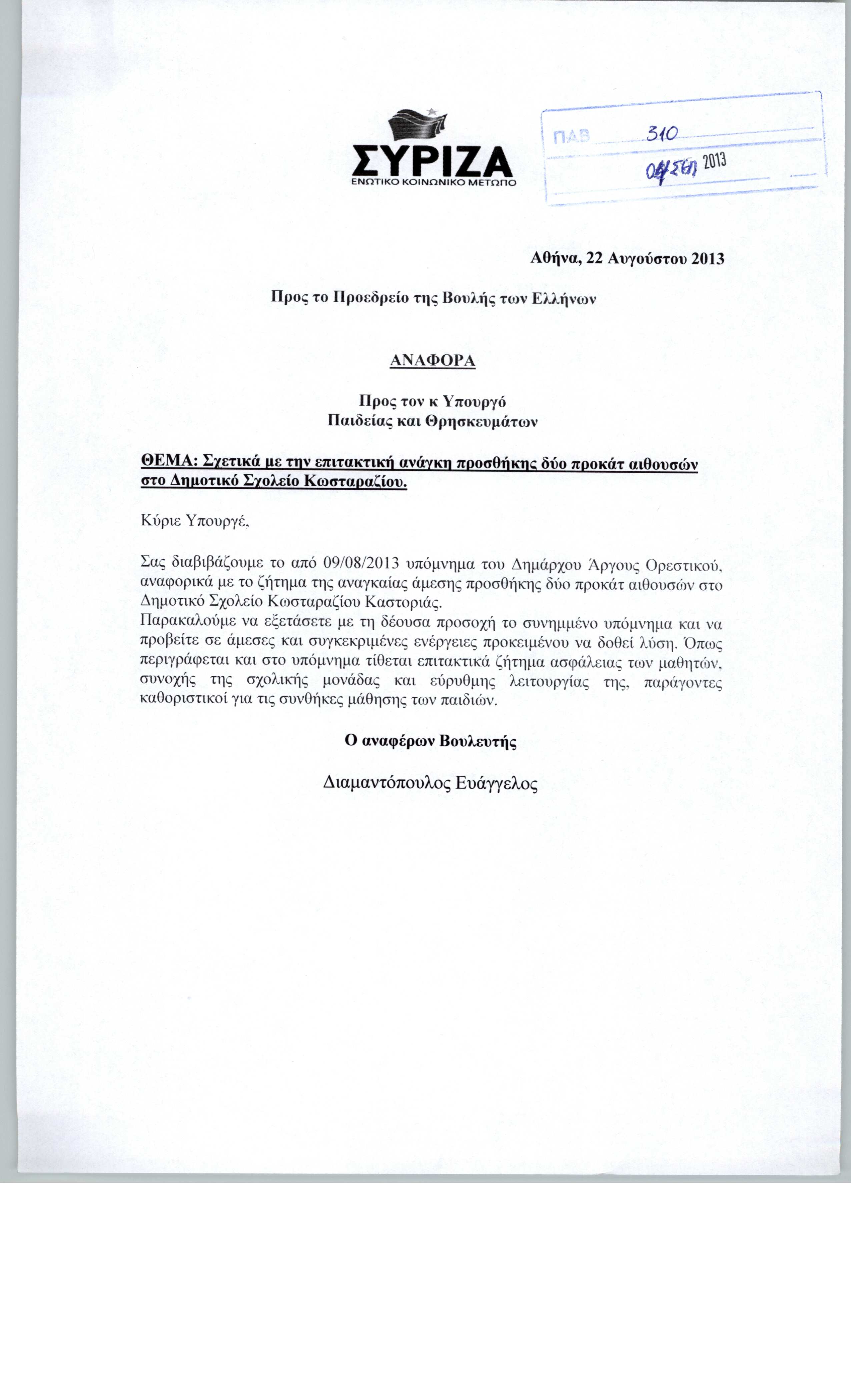 - αιτείται την άμεση προσθήκη δύο προκάτ αιθουσών στο Δημοτικό Σχολείο Κωσταραζίου Καστοριάς.