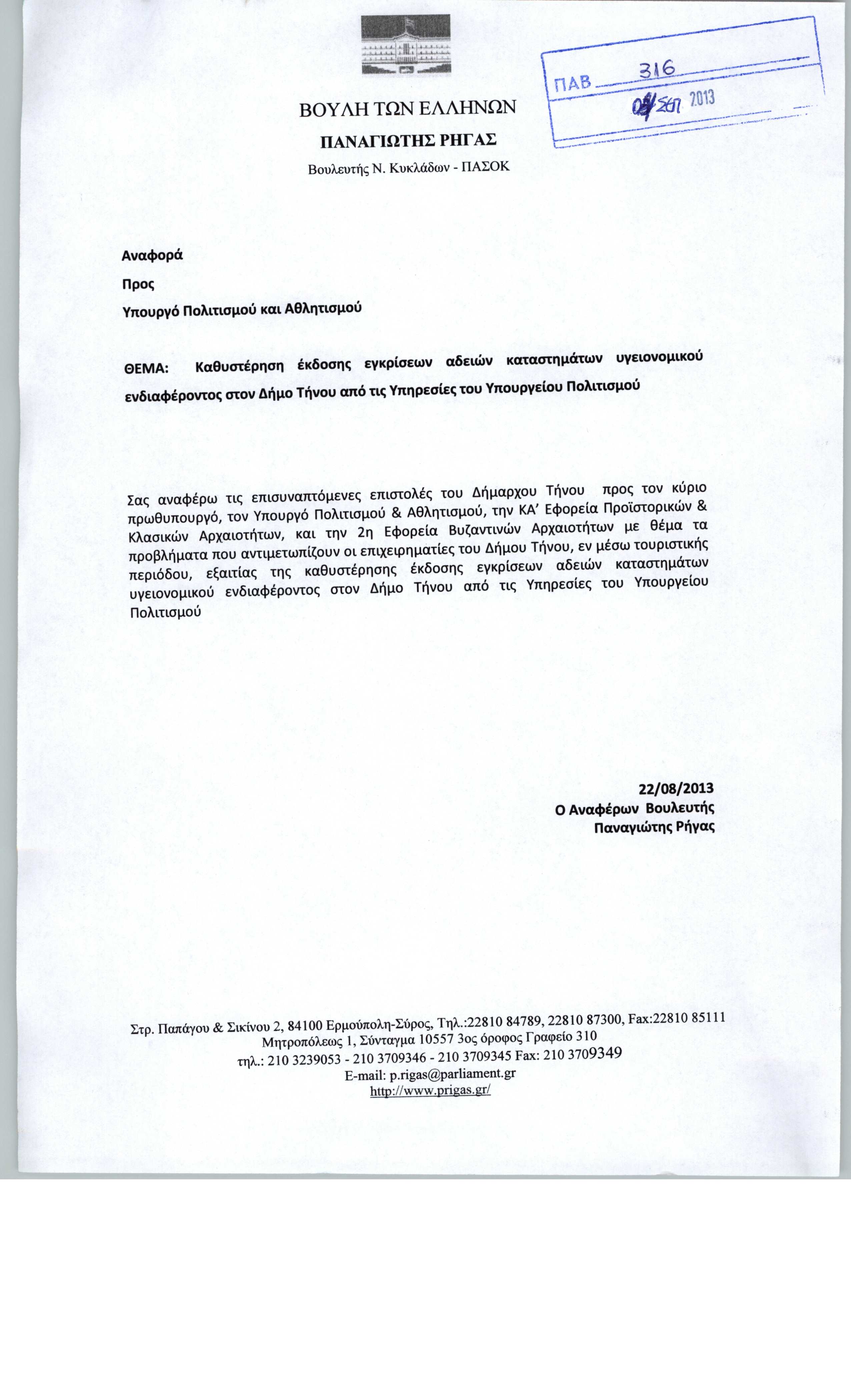 - αιτείται την επίλυση θέματος που αφορά την καθυστέρηση έκδοσης εγκρίσεων αδειών καταστημάτων υγειονομικού ενδιαφέροντος στο Δήμο Τήνου.