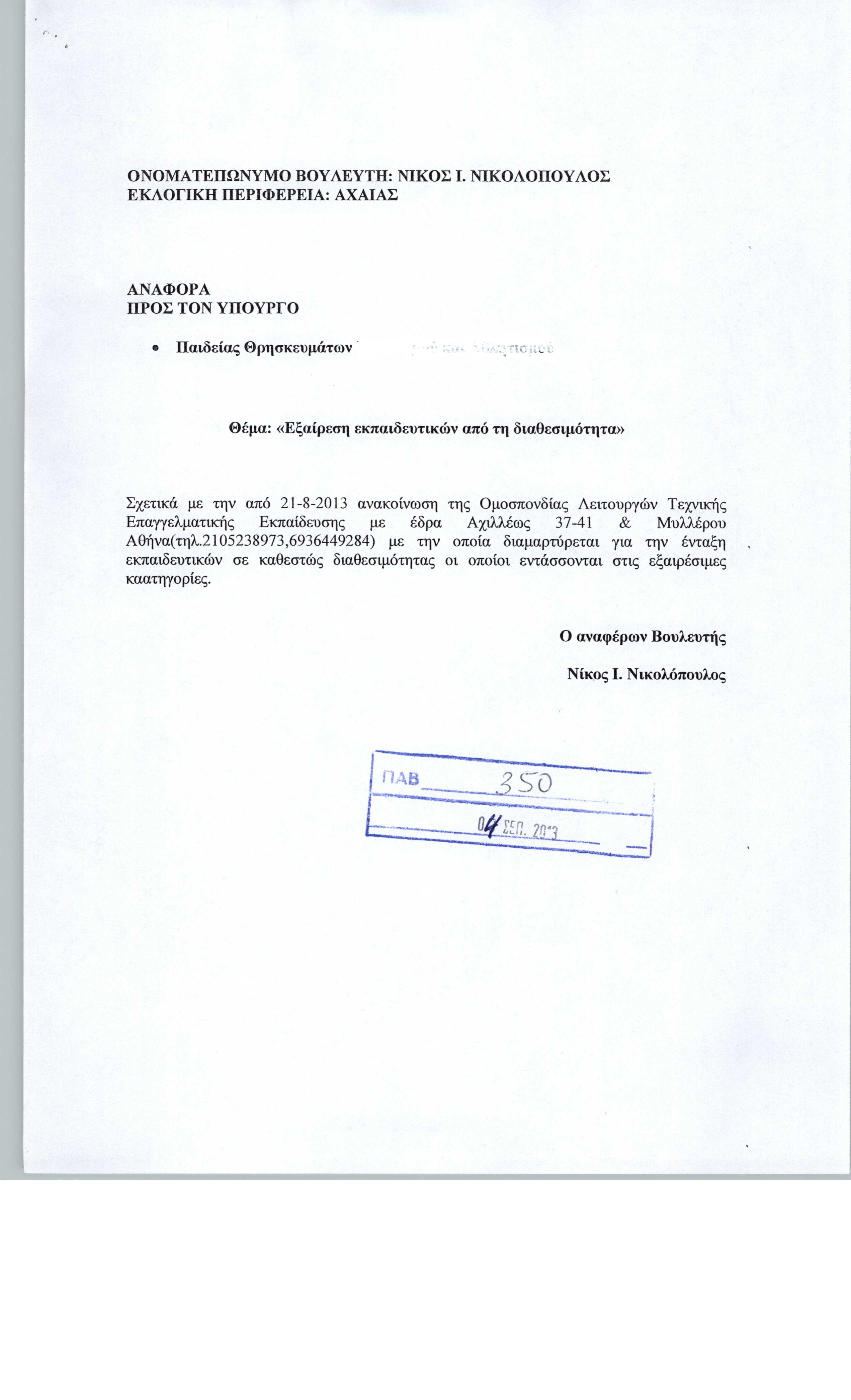 - διαμαρτύρεται για την ένταξη εκπαιδευτικών εξαιρέσιμων κατηγοριών σε καθεστώς διαθεσιμότητας.