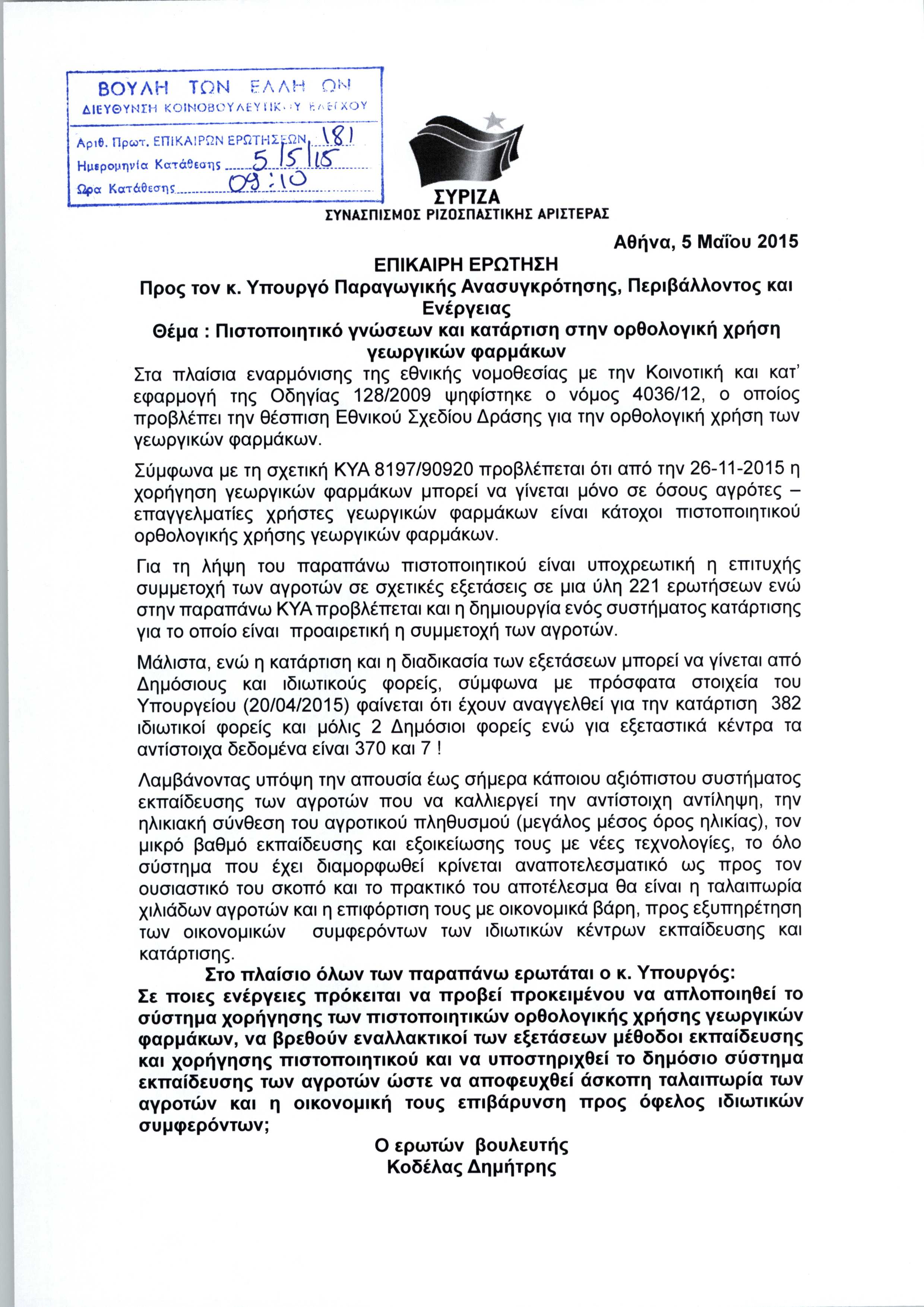 - Πιστοποιητικό γνώσεων και κατάρτιση στην ορθολογική χρήση γεωργικών φαρμάκων
