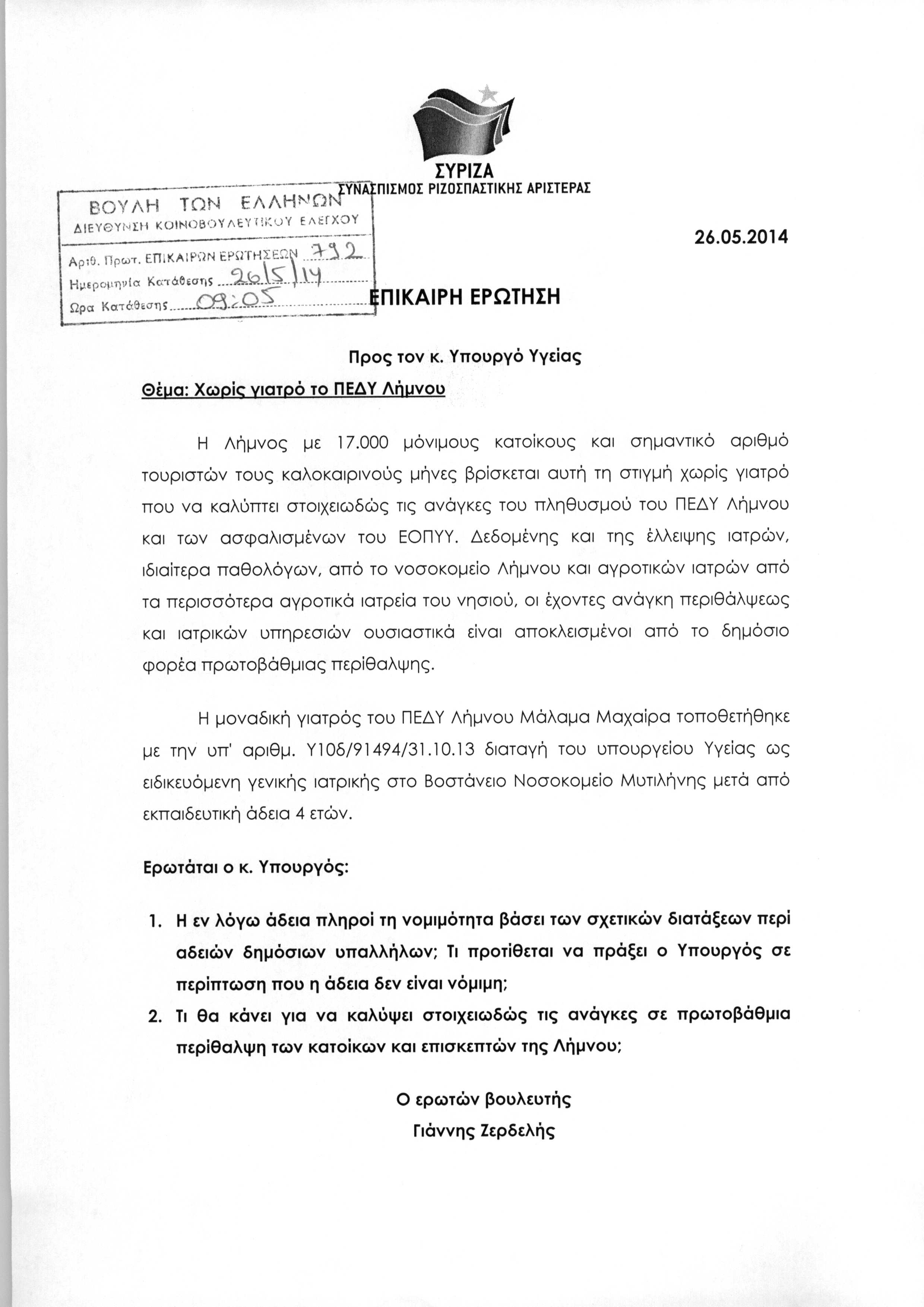 - Σχετικά με την άμεση κάλυψη των αναγκών σε πρωτοβάθμια περίθαλψη των κατοίκων και επισκεπτών της Λήμνου.
